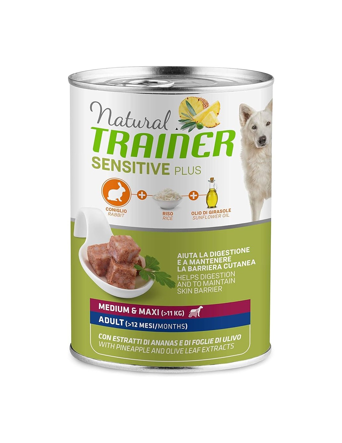 Coniglio 25% , riso 7% , olio di girasole 2% , proteina di riso , sostanze minerali , farina di riso fermentato , estratto secco di radici di cicoria (fonte di inulina)* 0,15% , estratto secco di gambo di ananas* 0,1% , estratto secco di foglie di ulivo* 0,05%. , *Ingrediente di origine naturale specifica Additivi nutrizionali: vitamina A 4050 UI, vitamina D3 240 UI, vitamina E 18 mg, solfato di zinco monoidrato 82,2 mg (zinco: 30 mg), solfato di rame(II) pentaidrato 5,9 mg (rame: 1,5 mg)., **Può contenere tracce di altre proteine animali. umidità 76%, proteina grezza 6,6%, grassi grezzi 4,5%, fibre grezze 0,8%, ceneri grezze 3%, omega-6 1%.