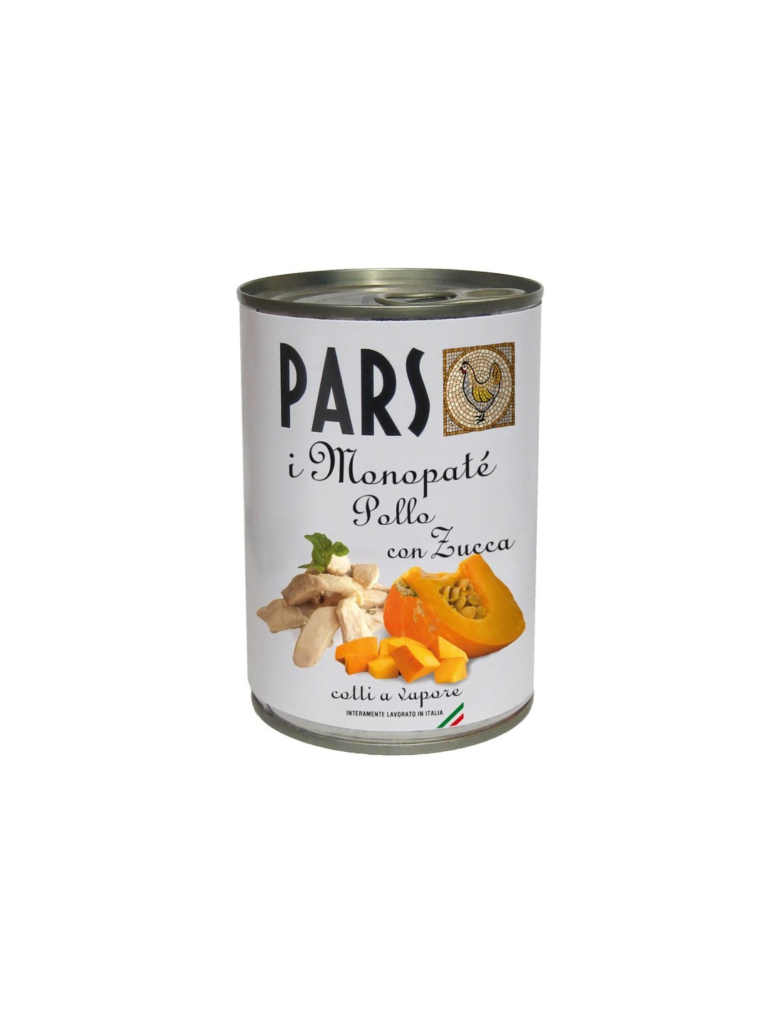 Composizione: carni e derivati (pollo 100%), ortaggi (zucca 1% da zucca disidratata), sostanze minerali, zuccheri (saccarosio). Additivi. Additivi nutrizionali: Vitamina A 1.220 UV/kg. Vitamina D3 150 UV/ka, Vitamina E 11 mg/kg, Taurina 490 mg/kg, solfato rameico pentaidrato 4,8 mg/kg (Cu 1,2 mg/kg). Componenti analitici: umidità 81%, proteina 6,5%, grassi grezzi 4,5%, fibra grezza 0,5%, ceneri grezze 2%. Modalità d'uso, razione giornaliera indicativa e conservazione. MAMMIFERI CARNIVORI: utilizzare puro, quantità giornaliera circa 60 g per ogni kg di peso corporeo. MAMMIFERI ONNIVORI: utilizzare miscelato con riso e verdure cotte, o con PARS riso integrale, PARS riso integrale con verdure, frutti ed erbe digestive. Quantità giornaliera da 50 g a oltre per ogni kg di peso corporeo. UCCELLI, RETTILI CARNIVORI: regolarsi in base all'esperienza acquisita o sentire il parere del veterinario. Servire a temperatura ambiente. Dopo l'apertura conservare in frigorifero e consumare entro 48 ore.