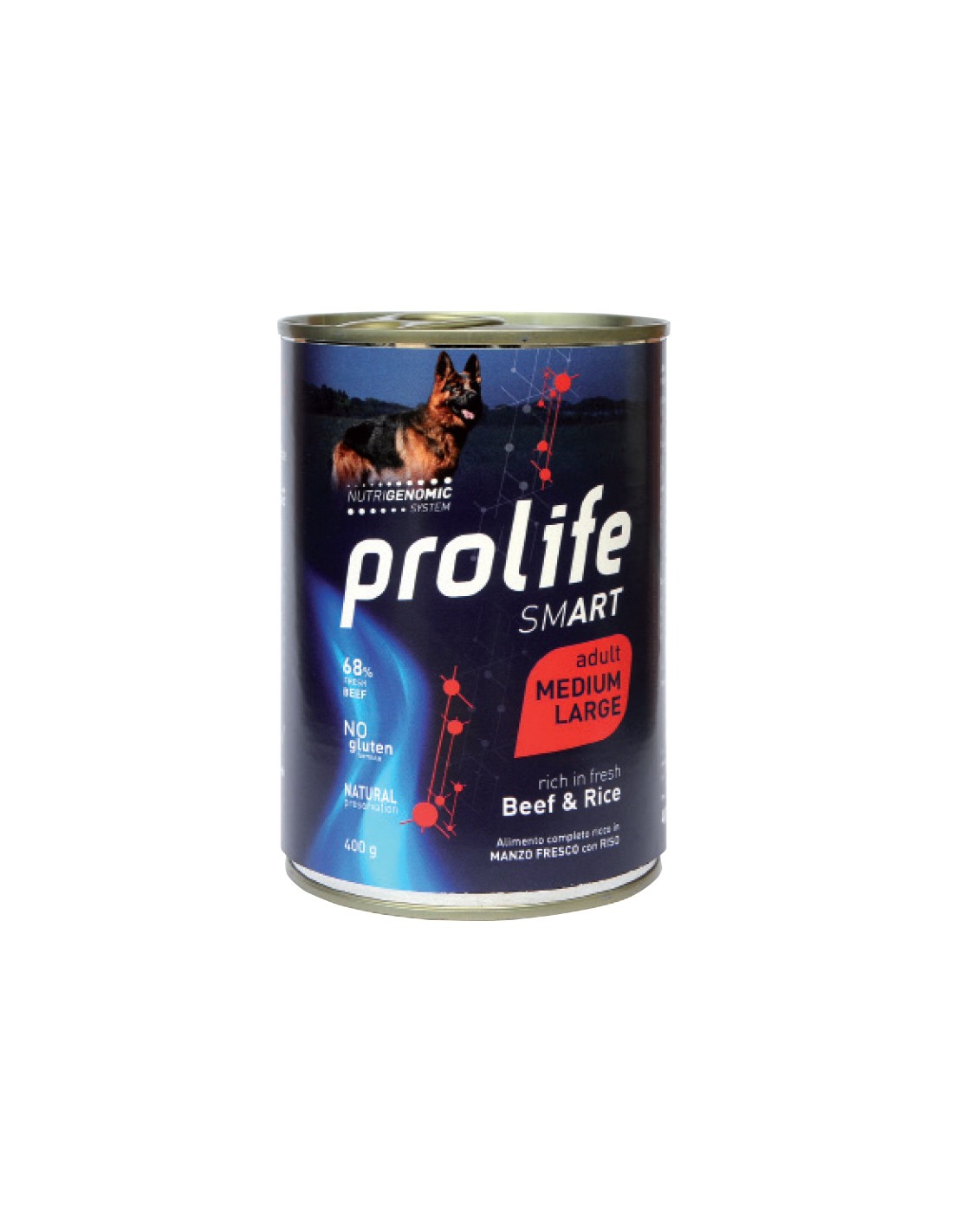 PROLIFE Smart Adult Beef & Rice un cibo umido completo con manzo fresco e riso per cani adulti di media e grossa taglia a partire dai 12 mesi. Alimento che può essere abbinato al cibo secco Prolife