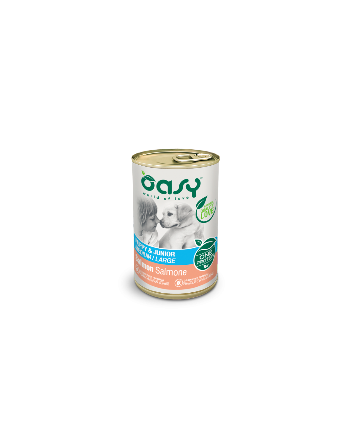 Salmone 94%, patate 4,1%, oli e grassi vegetali, fruttoligosaccaridi 0,1%.