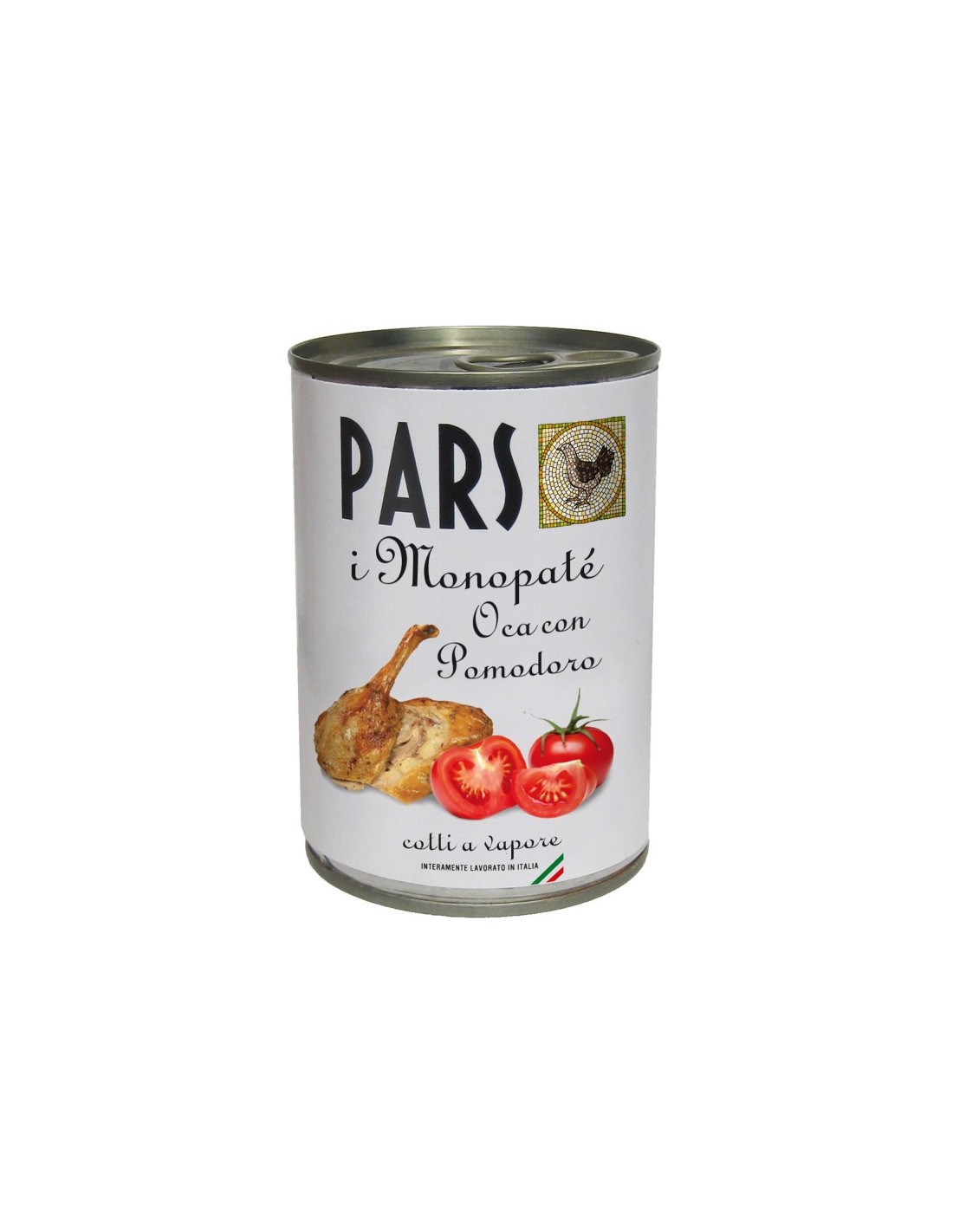 Composizione: carni e derivati (oca 100%), ortaggi (pomodoro 1% da pomodoro disidratato), sostanze minerali, zuccheri (saccarosio). Additivi. Additivi nutrizionali: Vitamina A 1.220 UI/kg, Vitamina D3 150 UI/kg, Vitamina E 11 mg/kg, Taurina 490 mg/kg, solfato rameico pentaidrato 4,8 mg/kg (Cu 1,2 mg/kg). Componenti analitici: umidità 81%, proteina 6%, grassi grezzi 9%, fibra grezza 0,5%, ceneri grezze 2%. Modalità d'uso, razione giornaliera indicativa e conservazione. MAMMIFERI CARNIVORI: utilizzare puro, quantità giornaliera circa 60 g per ogni kg di peso corporeo. MAMMIFERI ONNIVORI: utilizzare miscelato con riso e verdure cotte, o con PARS riso integrale, PARS riso integrale con verdure, frutti ed erbe digestive. Quantità giornaliera da 50 g a oltre per ogni kg di peso corporeo. UCCELLI, RETTILI CARNIVORI: regolarsi in base all'esperienza acquisita o sentire il parere del veterinario. Servire a temperatura ambiente. Dopo l'apertura conservare in frigorifero e consumare entro 48 ore.