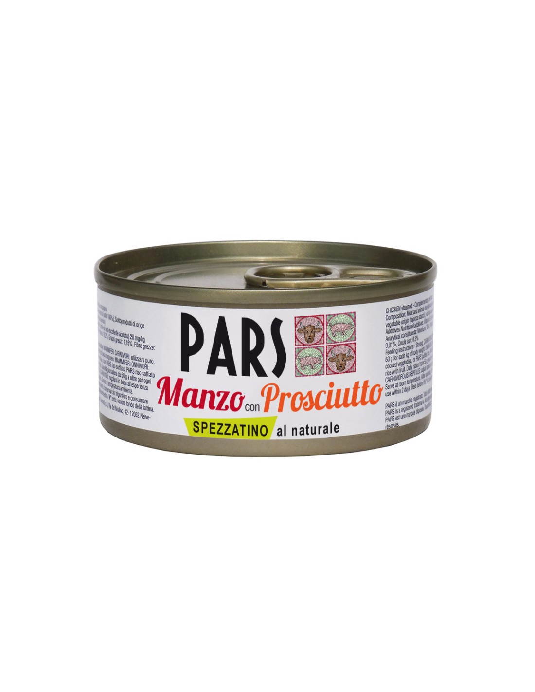 Composizione. Manzo 30%, Prosciutto 20%, saccarosio. Additivi. Additivi nutrizionali: Vitamina E 12,2 mg/kg. Componenti analitici. Umidità 78,0%, Proteina 18,0%, Grassi grezzi 2,0%, Fibra grezza 0,3%, Ceneri grezze 1,5%. Modalità d'uso e razioni giornaliere indicative. MAMMIFERI CARNIVORI: circa 60 g per ogni kg di peso corporeo in abbinamento ad altri alimenti PARS. MAMMIFERI ONNIVORI: utilizzare miscelato con riso e verdure cotte, o con PARS riso o orzo soffiato. Quantità giornaliera da 50 g a oltre per ogni Kg di peso corporeo. UCCELLI, RETTILI CARNIVORI: regolarsi in base all'esperienza acquisita o sentire il parere del veterinario. Servire a temperatura ambiente. Vi ricordiamo che i fabbisogni possono variare notevolmente in base al singolo soggetto (temperamento, età, attività, metabolismo, ecc.) ed alla temperatura ambientale. Lasciare sempre una ciotola d'acqua fresca a disposizione.