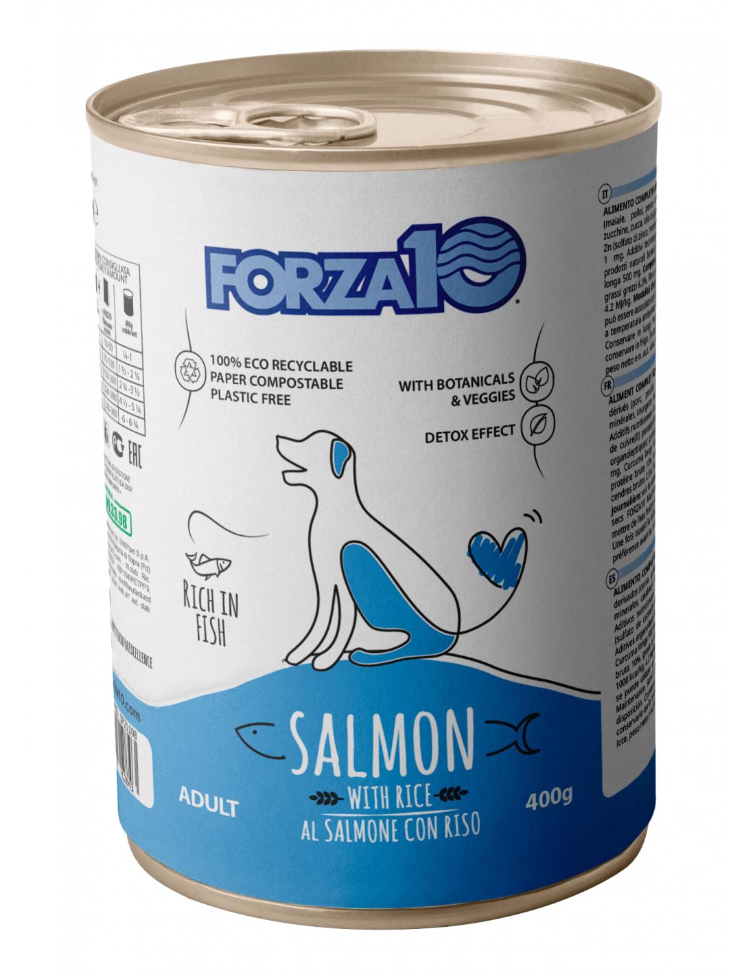 Composizione: carni e derivati, salmone 14%, riso 4%, sostanze minerali, zucchine, zucca, olio di girasole 0.5%, tarassaco 0.2%, curcuma 0.05%.