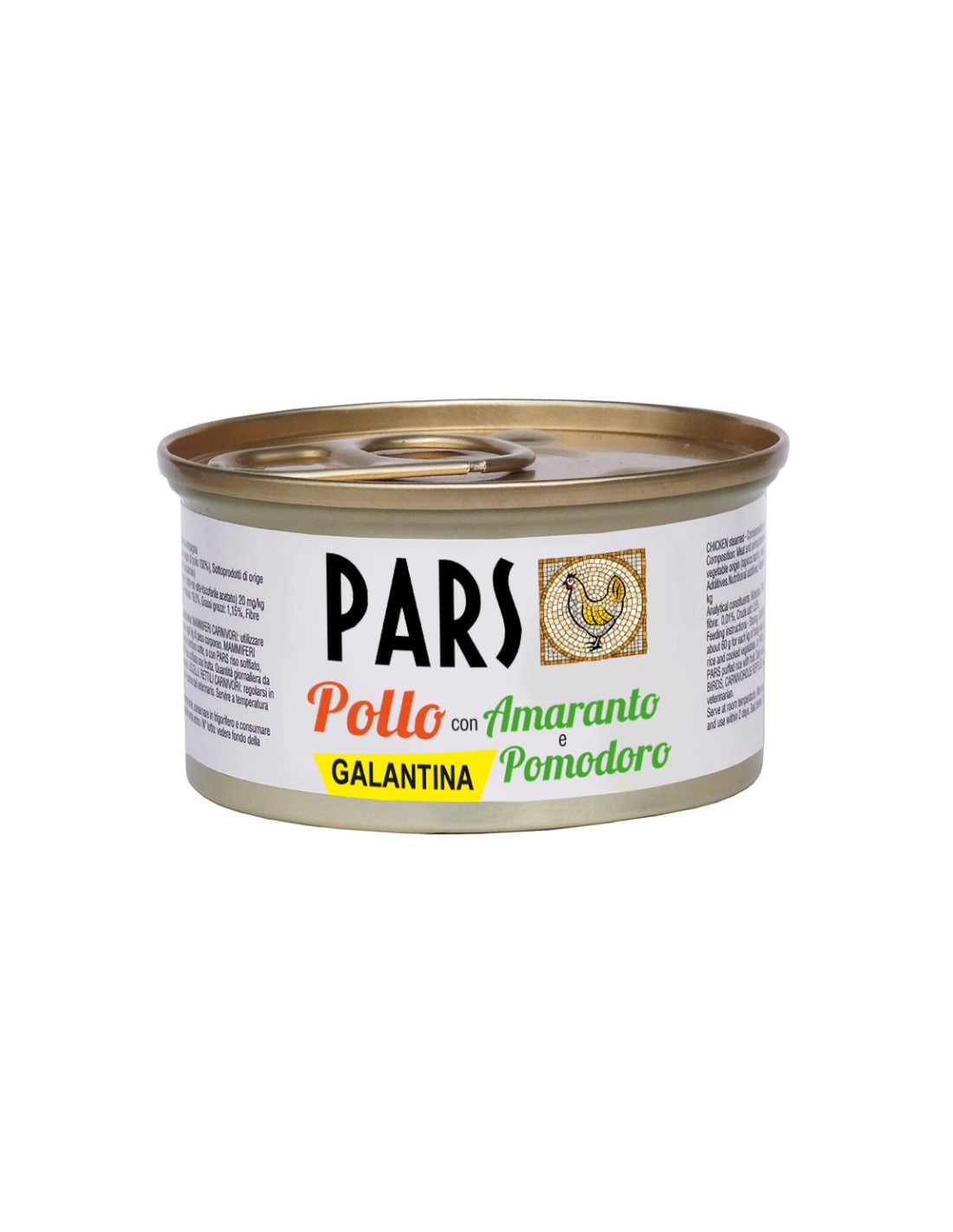 Composizione. Pollo 57%, amaranto 4%, pomodori 4%, barbabietola, sedano, mela, miglio, basilico, saccarosio. Additivi. Additivi nutrizionali: Vitamina A 1200 UI, Vitamina D3 140 UI, Vitamina E 10 mg/kg, 3b405 (Cu 1,5 mg/kg). Componenti analitici. Umidità 78,0%. Proteina 10,5%. Grassi grezzi 5,5%, Fibra grezza 0,9%, Ceneri grezze 2,0%. Modalità d'uso e razioni giornaliere indicative. MAMMIFERI CARNIVORI: circa 60 g per ogni kg di peso corporeo in abbinamento ad altri alimenti PARS. MAMMIFERI ONNIVORI: utilizzare miscelato con riso e verdure cotte, o con PARS riso soffiato, PARS riso soffiato con verdure e frutta. Quantità giornaliera da 50 g a oltre per ogni Kg di peso corporeo. UCCELLI, RETTILI CARNIVORI: regolarsi in base all'esperienza acquisita o sentire il parere del veterinario. Servire a temperatura ambiente. Vi ricordiamo che i fabbisogni possono variare notevolmente in base al singolo soggetto (temperamento, età, attività, metabolismo, ecc.) ed alla temperatura ambientale. Lasciare sempre una ciotola d'acqua fresca a disposizione.