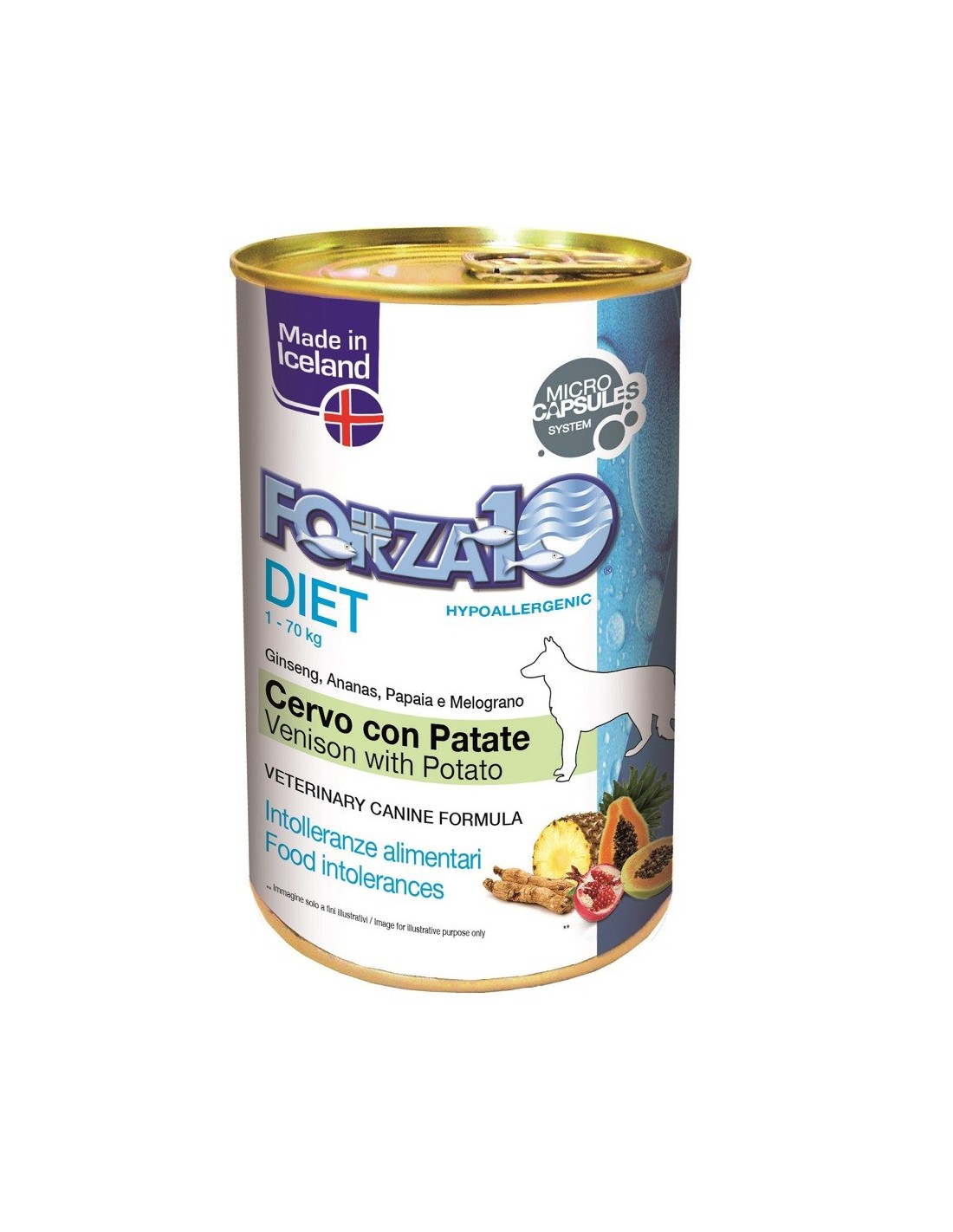 Composizione: carni e derivati 70% (cervo 100%), patata 4.1%, oli e grassi vegetali, sostanze minerali, prodotti ottenuti dalla trasformazione di vegetali (Ananas spp. 0.014%), prodotti e sottoprodotti della trasformazione di frutta e verdura fresca (Carica papaya 0.012%), prodotti ottenuti dalla trasformazione di erbe, amido.