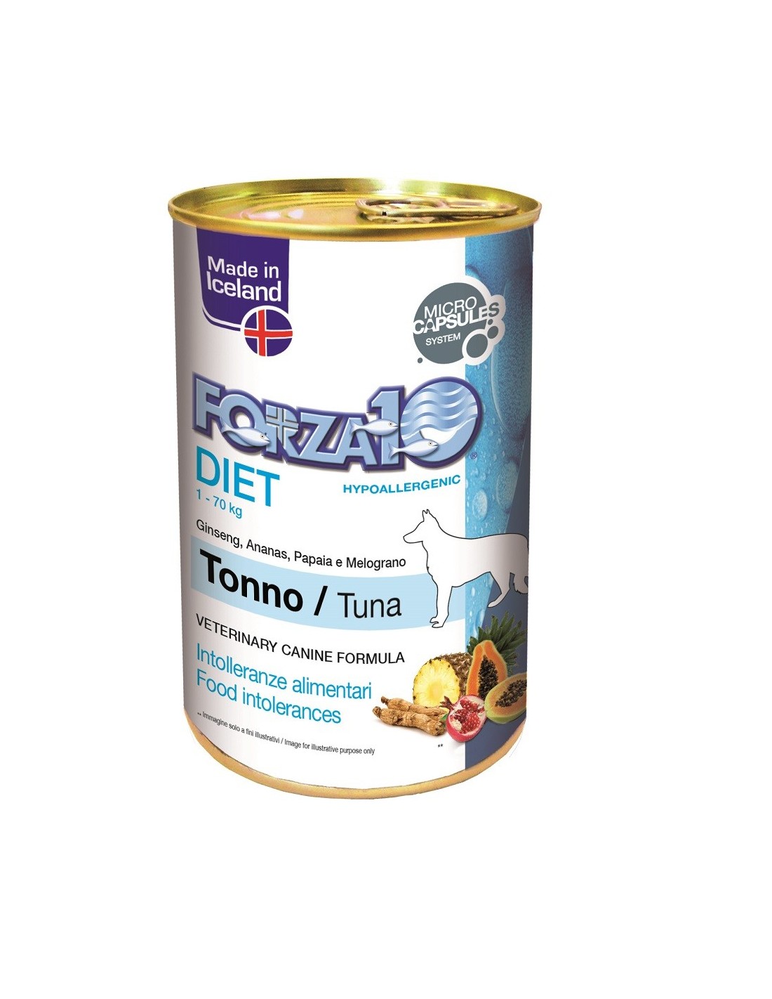 Composizione: pesce (tonno 50%), oli e grassi vegetali, sostanze minerali, amido, Grifola frondosa 0.0135%, prodotti ottenuti dalla trasformazione di vegetali (Ananas spp. 0.014%), prodotti e sottoprodotti della trasformazione di frutta e verdura fresca (Carica papaya 0.012%), prodotti ottenuti dalla trasformazione di erbe (Aloe vera 0.0066%), alghe (Haematococcus pluvialis (astaxantina 0.0025%).
