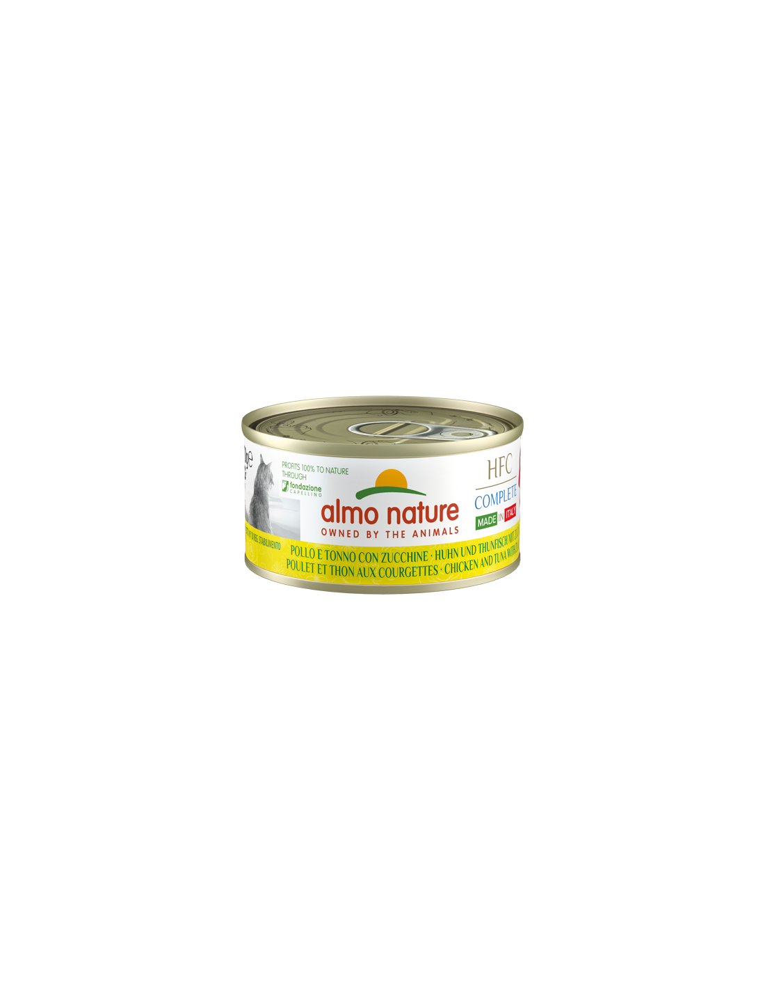 Pollo 40%, tonno 30%, zucchine 4%, olio di girasole, sostanze minerali.