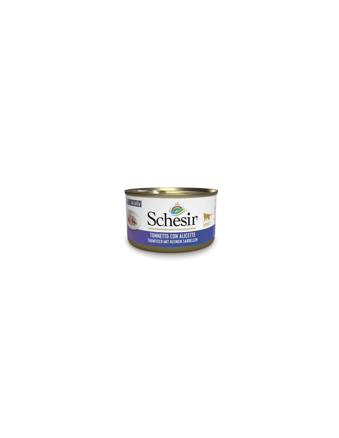 Ingredientitonnetto 51%, alici 4%, riso 1,5%Componenti Analiticiproteina 12%, grassi grezzi 0,8%, fibre grezze 0,5%, ceneri grezze 1%, umidità 85%
