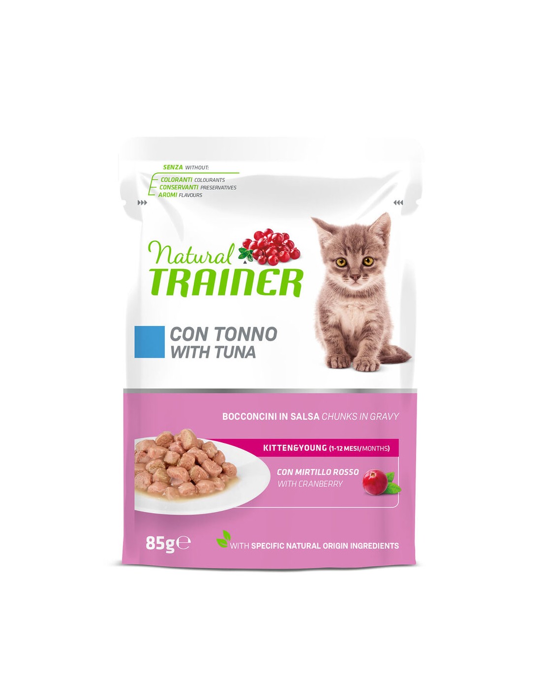 Ingredienti: Pollame, maiale, pollo, tonno 4%, merluzzo, amido di granturco, manzo, fibra di pisello*, sostanze minerali, amido di patate, destrosio, mirtillo rosso disidratato* 0,01%. *Ingredienti specifici di origine naturale.