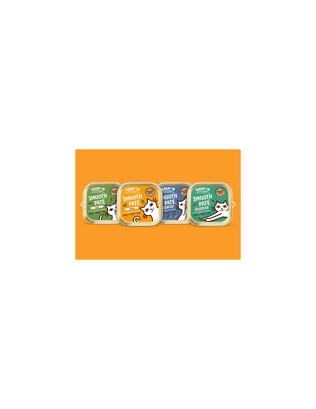 La nostra gamma di paté per gatti è un punto fermo per tutti i gatti di Lily ed il motivo è facile da capire. Dalla consistenza morbida e vellutata, ogni ricetta è ricca di ingredienti veri: una tentazione a cui nessun gattino saprà resistere. Senza zuccheri aggiunti (veramente!), queste ricette senza cereali sono nutrizionalmente complete e ciò le rende ottimali per preservare il buono stato dell’animale.