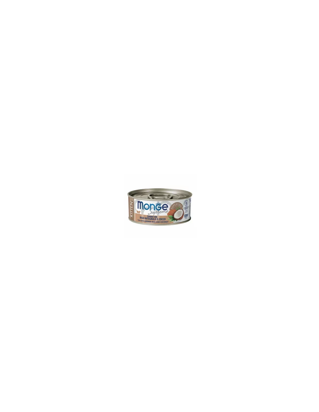 Tonnetto striato (Katsuwonus pelamis) 55%, riso integrale 4%, cocco 4%, tapioca, Fruttoligosaccaridi (F.O.S.) 0,04%.