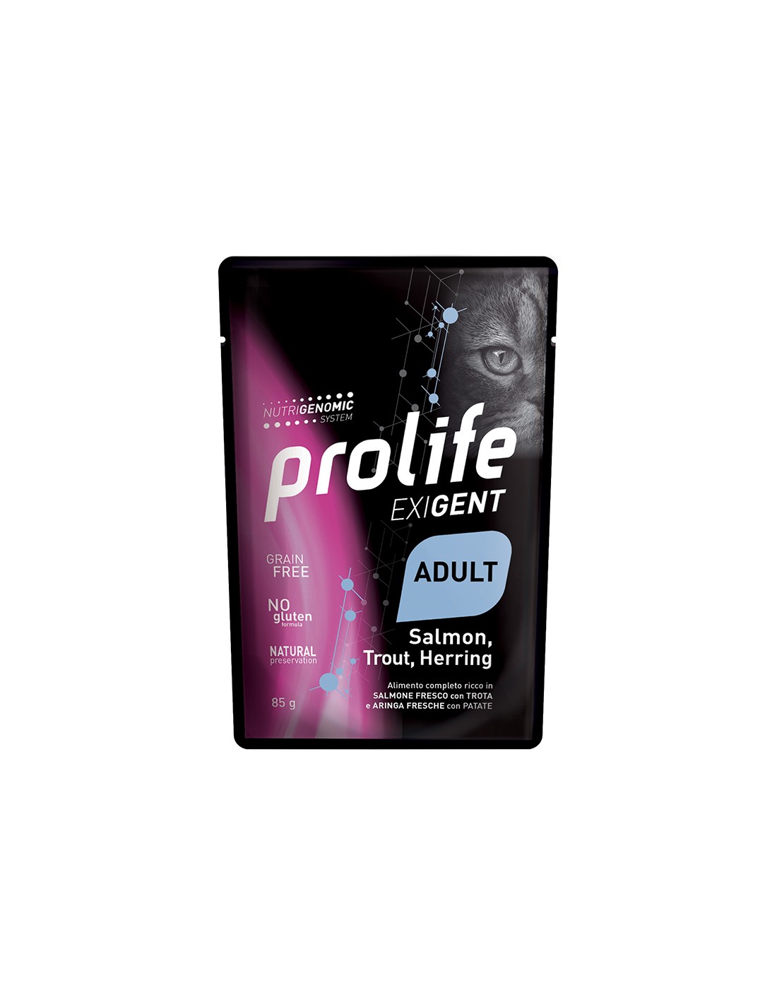 Salmone fresco 58%, Trota fresca 5%, Aringa fresca 5%, Patate 4%, Alltech® Nutrigenomic System 1,2%, Cellulosa 1%, Sostanze minerali, Olio di salmone 0,2%, Fruttoligosaccaridi