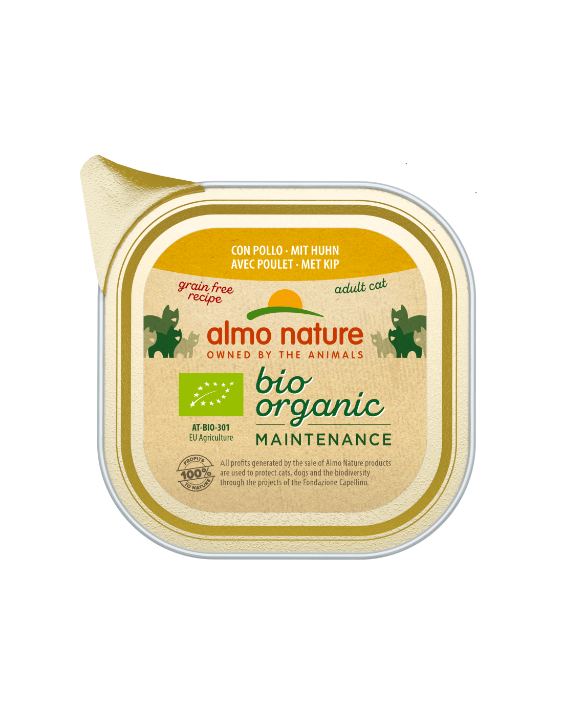 IngredientiCarni* e derivati* 61% (pollo* 26%), sostanze minerali. *Ingredienti biologici.