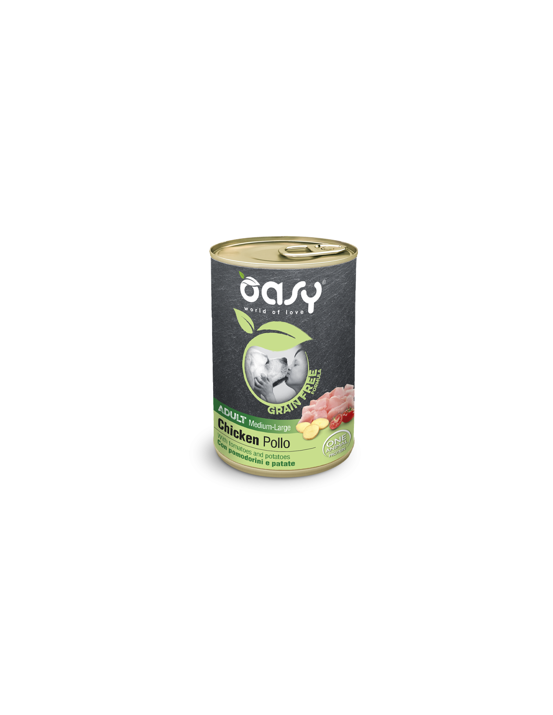 pollo 50%, brodo di cottura, pomodorini 5%, patate 5%.