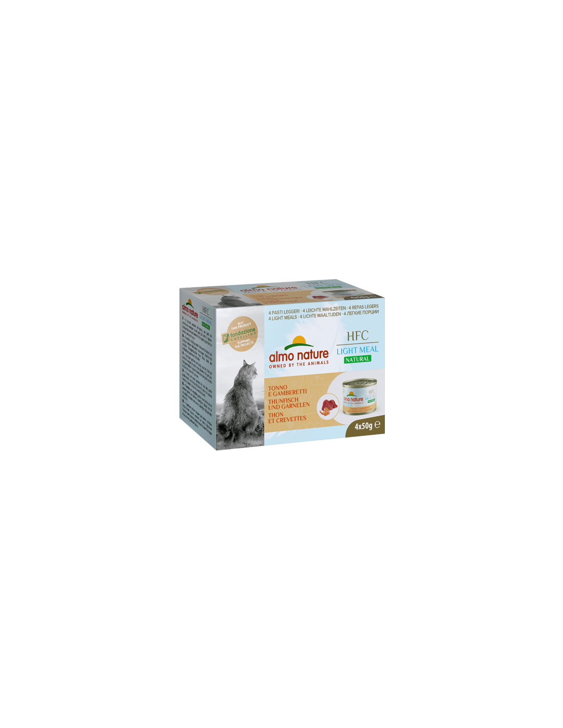 Tonno 50%, brodo di pesce 43%, gamberetti 5%, riso 2%.