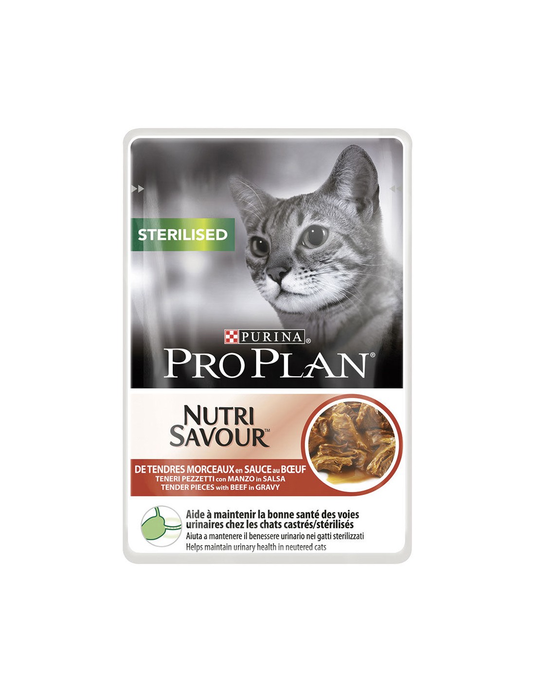 Purina Pro Plan STERILISED: Aiuta a mantenere il peso corporeo ideale e il benessere urinario nei gatti sterilizzati. Aiuta a mantenere le difese naturali forti grazie agli antiossidanti, come la vitamina E. Disponibile in salsa con Manzo e in salsa con Pollo.