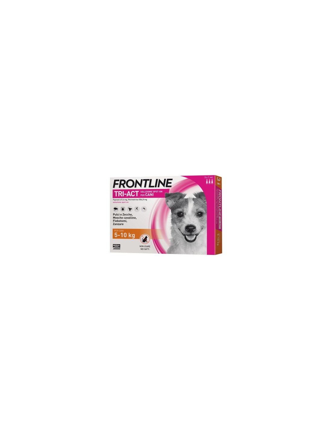 Frontline Tri-Act è una soluzione antiparassitaria da applicare sulla cute di cani di taglia piccola da 5 a 10 kg per il trattamento delle infestazioni da pulci, zecche e contro zanzare, flebotomi e mosche cavalline.