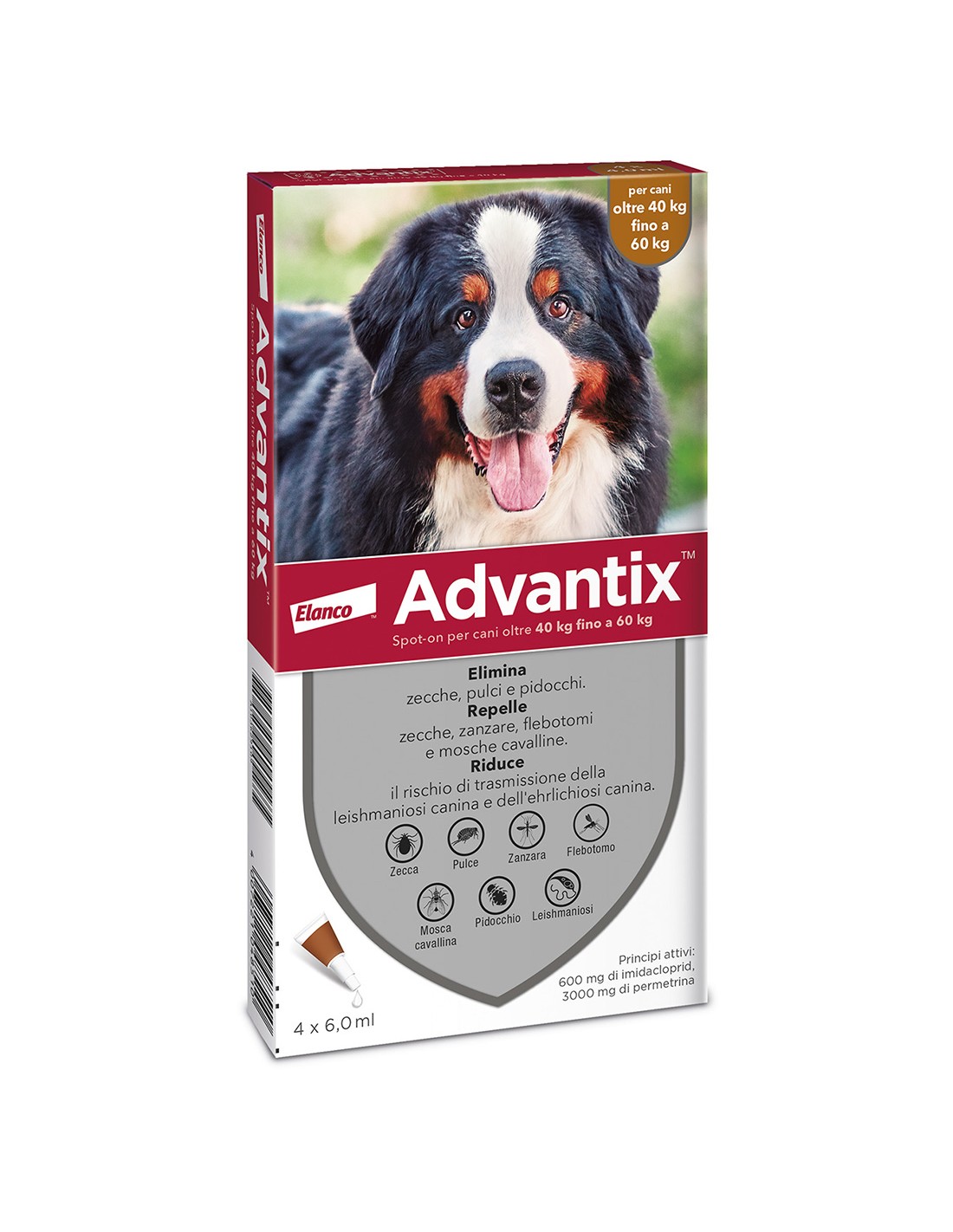 Advantix® è indicato anche per il trattamento dei pidocchi nel cane.Repelle zanzare e pappataci (o flebotomi), riducendo il rischio di malattie come la LEISHMANIOSI. Repelle le zecche prima che possano pungere e uccide quelle venute a contatto con la cute, riducendo il rischio di trasmissione di malattie come Ehrlichiosi, Rickettsiosi e Borreliosi. Fornisce attività repellente nei confronti della mosca cavallina aiutando nella prevenzione della dermatite da puntura di mosca.