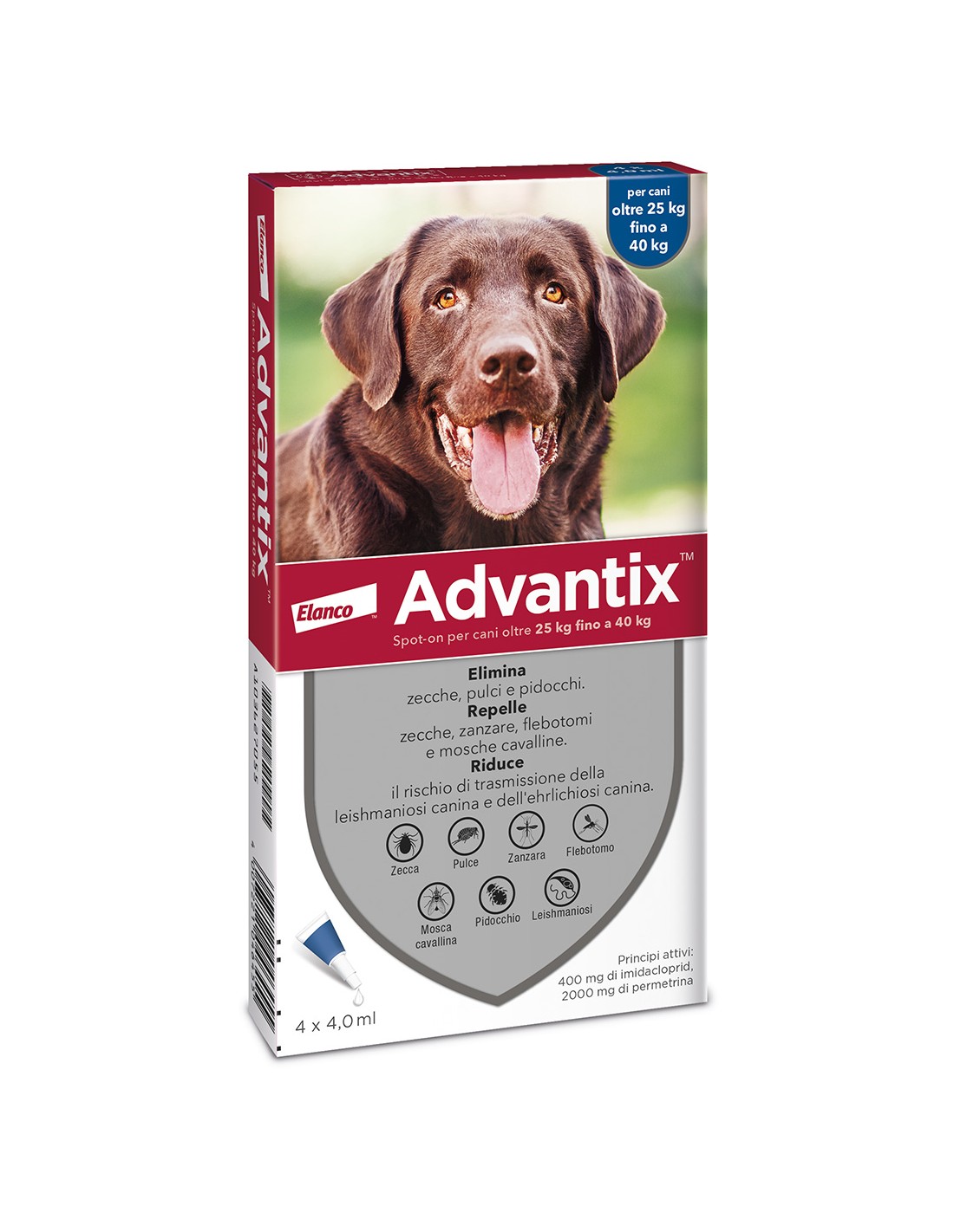 Advantix® è indicato anche per il trattamento dei pidocchi nel cane.Repelle zanzare e pappataci (o flebotomi), riducendo il rischio di malattie come la LEISHMANIOSI. Repelle le zecche prima che possano pungere e uccide quelle venute a contatto con la cute, riducendo il rischio di trasmissione di malattie come Ehrlichiosi, Rickettsiosi e Borreliosi. Fornisce attività repellente nei confronti della mosca cavallina aiutando nella prevenzione della dermatite da puntura di mosca.