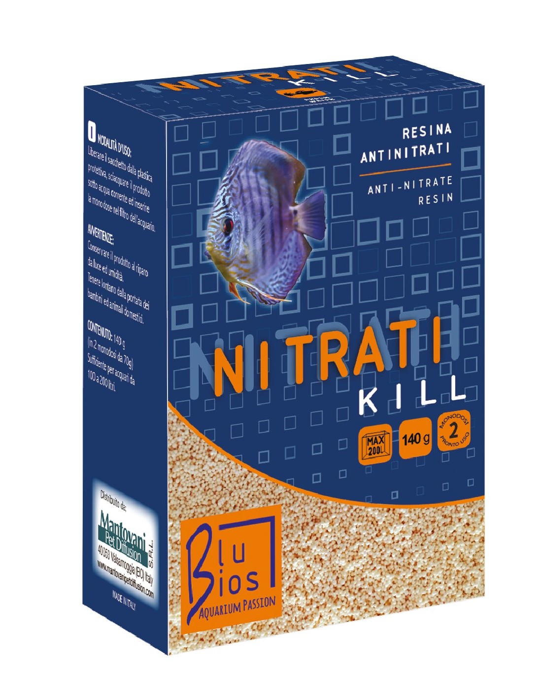 Resina anti-nitrati in 2 sacchetti monodose pronto uso. Sufficiente per acquari da 100 a 200 litri. Nitrati Kill è indicato per acquari d’acqua dolce. Non è nocivo per pesci e piante e non altera altri valori dell’acqua. L’efficacia e la durata di Nitrati Kill in acqua dipende molto dalla popolazione di pesci dell’acquario e dalle sue condizioni specifiche. Indicativamente, l’efficacia può oscillare fra i 2 ed i 6 mesi. L’uso preventivo di Nitrati Kill impedisce il formarsi dei nitrati, mentre, in acquari in cui sono già presenti, li assorbe rapidamente.