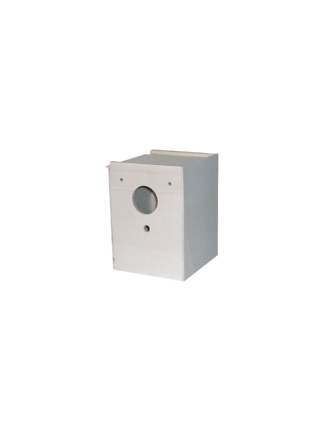 Nido a cassette in legno per coccorite, con foro cicolare di ingresso e sportellino scorrevole superiore per il controllo delle nidiate.