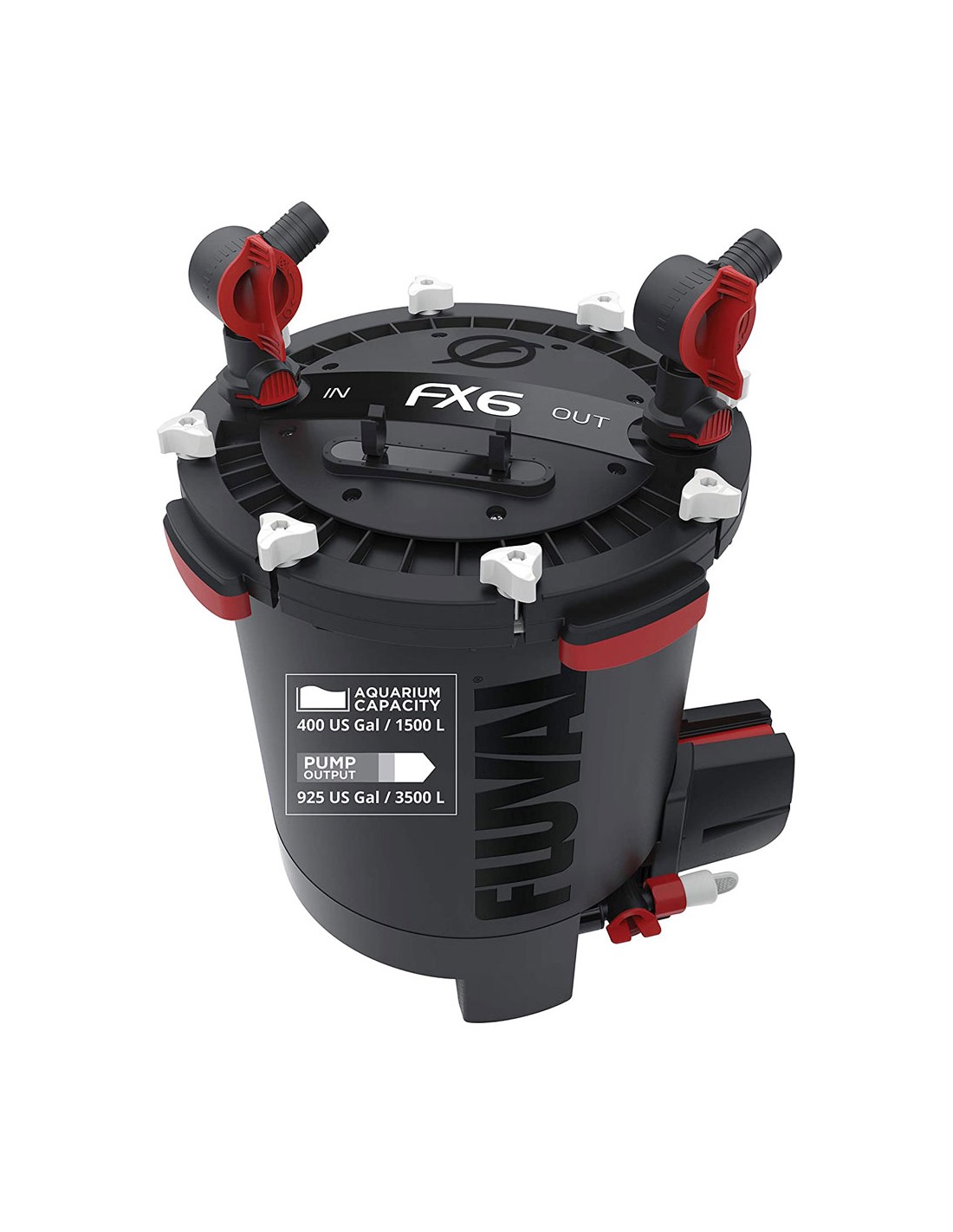 Il filtro per esterno compatto ad alta efficienza Fluval FX6 per acquari dispone di due pulsanti di promemoria utilizzati per indicare la data dell'ultima manutenzione, le valvole autobloccanti AquaStop, la valvola di scarico e l'adescamento automatico. Compatto, misura solo 54 cm di altezza.