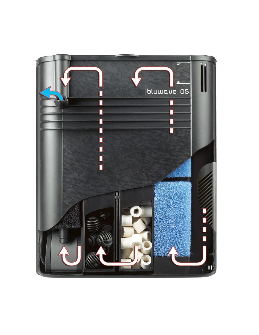 L’ingresso dell’acqua posto in alto del filtro forza il movimento delle particelle presenti sulla superficie dell’acqua e limita il formarsi della patina oleosa che si crea sulla superficie stessa; l’ingresso posto in basso raccoglie invece i detriti presenti nell’acquario. E’ inoltre stato previsto un vano per termoriscaldatore Bluclima (opzionale). Il filtro Bluwave è pratico e facile da pulire grazie ai vani estraibili e permette di essere perfettamente posizionato all’interno dell’acquario grazie ai sistemi di fissaggio con ganci o ventose di cui è dotato.