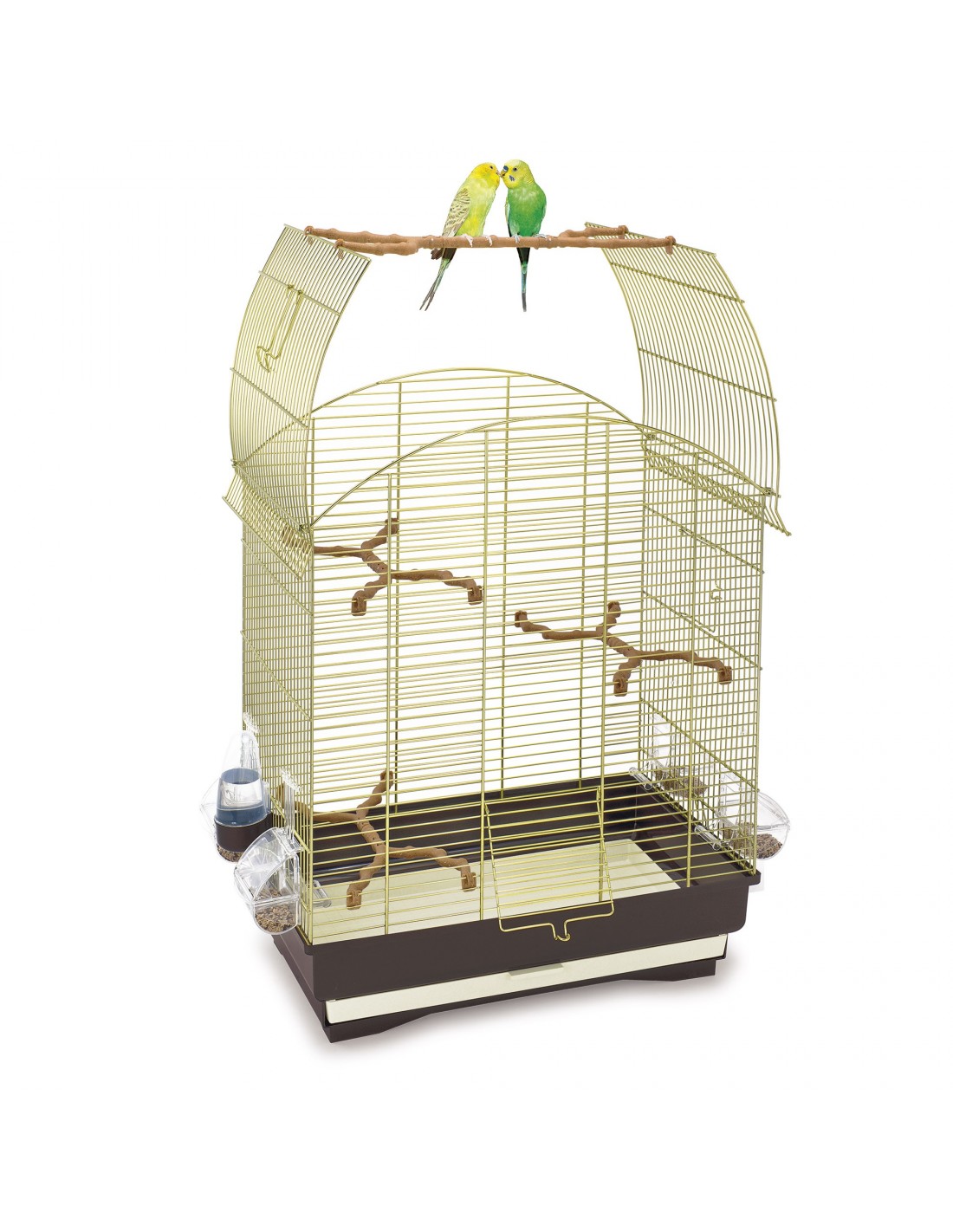 La gabbia Agata offre ampio spazio a canarini, cocorite e piccoli esotici. Di forma rettangolare con tetto arrotondato apribile e struttura in rete ottonata e un fondo marrone. Curata nei dettagli,è dotata di maniglia per un facile trasporto e di un’ampia portina frontale ad apertura verticale e una più piccola laterale, per accedere comodamente per ogni eventuale necessità. Posizionando il posatoio a forma di ramo sul tetto apribile, il vostro amico piumato potrà entrare e uscire a suo piacimento. Per una praticissima pulizia della gabbia estraete il cassetto posto sul fondo e potrete rimuovere lo sporco quotidiano con estrema facilità. Gli accessori che completano questa gabbia rispondono a tutte le necessità del vostro uccellino: quattro mangiatoie Mia in plastica trasparente, un beverino Tweety 100 e quattro posatoi a forma di ramo che permettono di variare continuamente la presa delle zampette, rendendo l’utilizzo simile a quello che si trova in natura. Provate il comodissimo optional Portagabbie 226 da abbinare in colore marrone, per spostarla senza difficoltà, grazie alle ruote piroettanti.