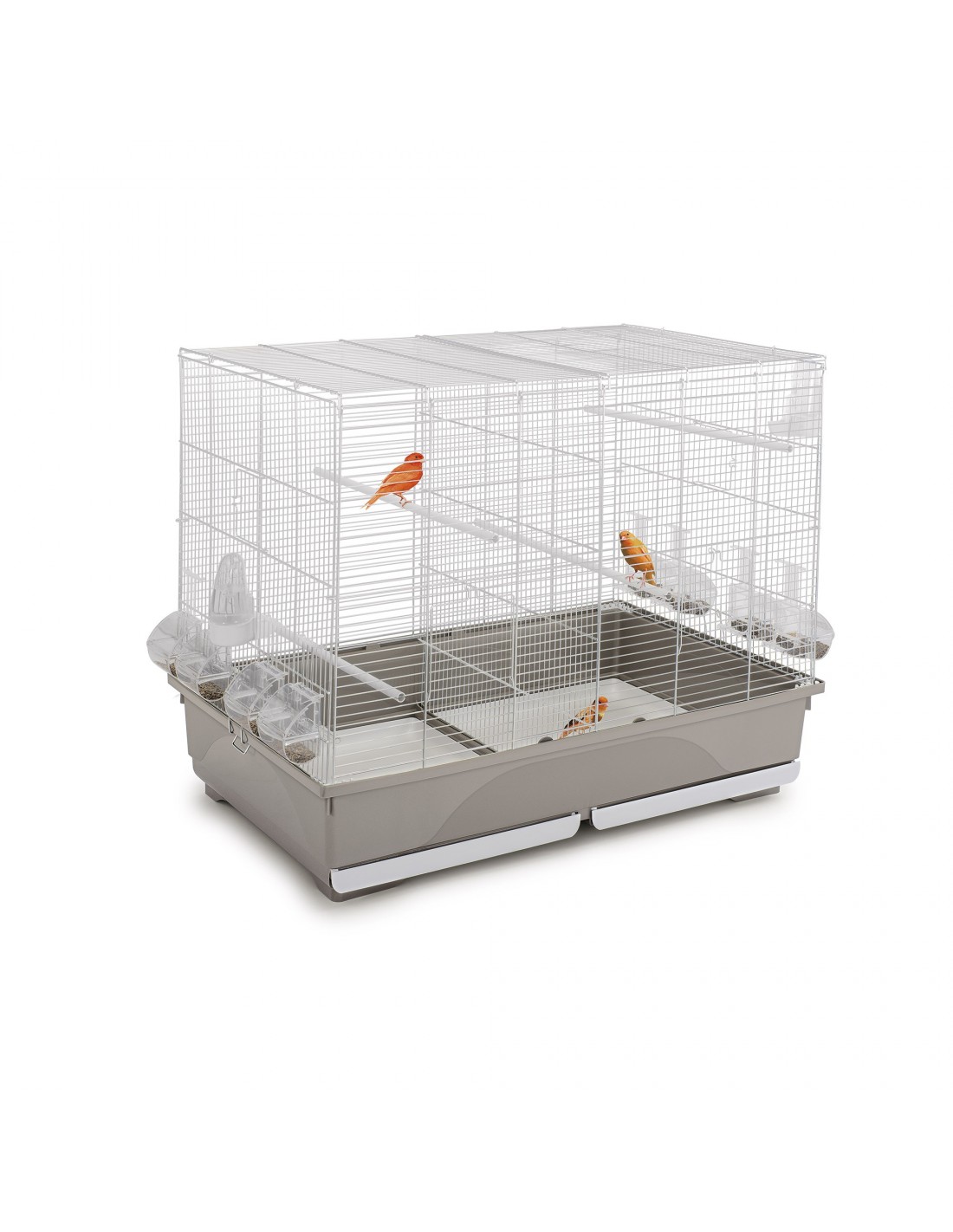 Tasha è una gabbia di dimensioni generose, con rete zincata e fondo in plastica color tortora, per canarini, esotici e piccoli pappagallini. Ideale per ospitare più coppie che possono essere separate per mezzo del separè che inserito dal tetto divide la gabbie in due. Tasha viene fornita di tutti gli accessori necessari, ben 8 mangiatoie Mia, due beverini Tweety. Dispone di un fondo con bordo alto anti sporco, con due cassetti estraibili per rendere più facile e pratica la pulizia. Se si avesse necessità di spostare la gabbia, risulterà utile il Portagabbie 23610 (acquistabile a parte come optional) per spostarla con facilità grazie alle ruote piroettanti.