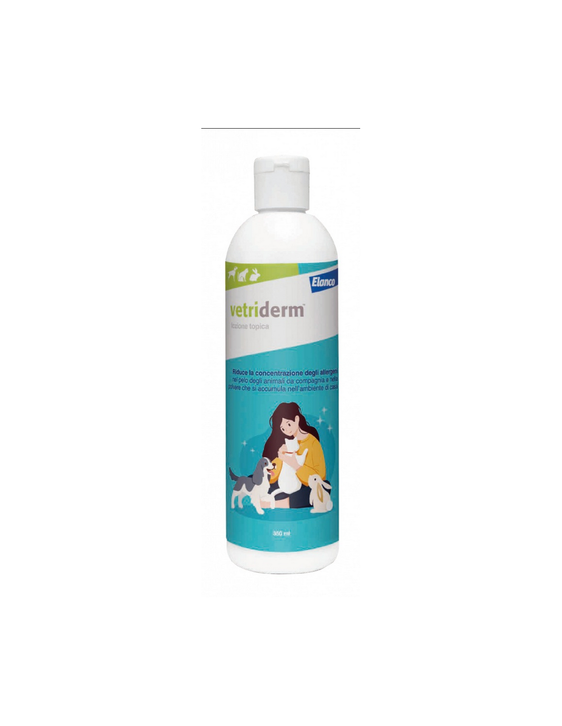 Grazie alla specifica composizione, Vetriderm aiuta a rimuovere dal pelo e dalla cute dell'animale i residui di forfora, saliva e urina, contribuendo a diminuire la quantità di allergeni presenti sul pelo dell'animale e nella polvere che si deposita in casa. In questo modo può contribuire a ridurre il rischio di reazioni in soggetti allergici agli animali da compagnia.*