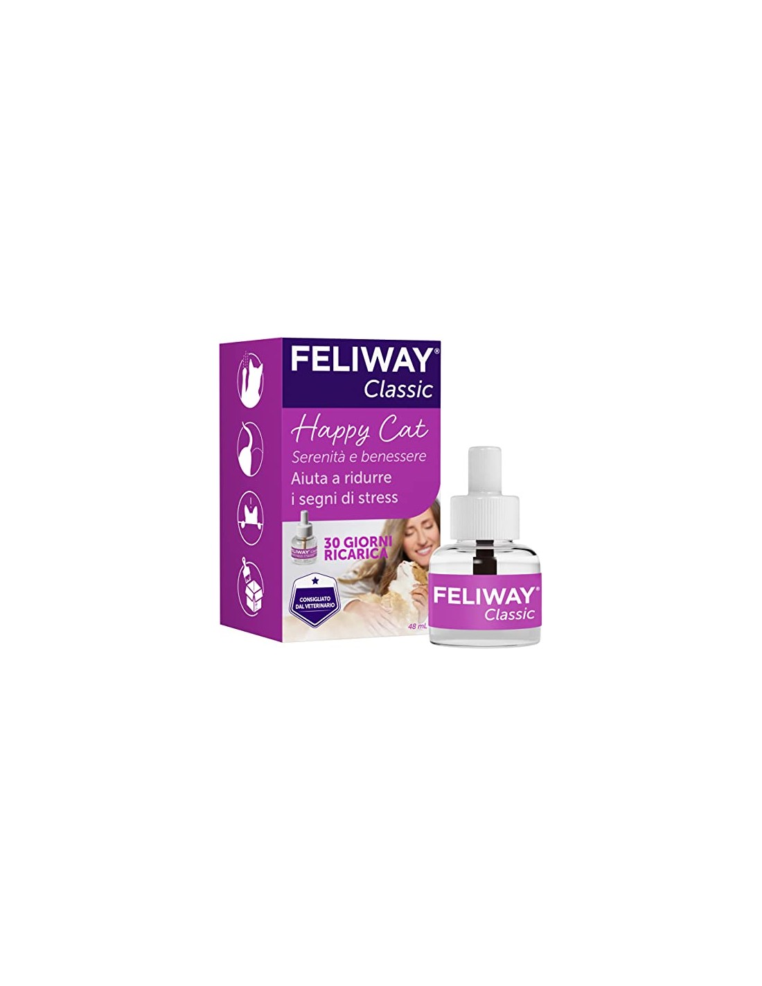 Feliway Classic è a base del feromone facciale felino che, in natura, i gatti depositano strofinando il muso sulle persone, mobili, porte e altri oggetti nella casa. È il segno che si sentono a loro agio e sicuri nell’ambiente in cui vivono. Feliway Classic utilizzato nell’ambiente in cui vive il gatto fornisce la stessa sensazione di sicurezza dei feromoni depositati dai gatti in natura.