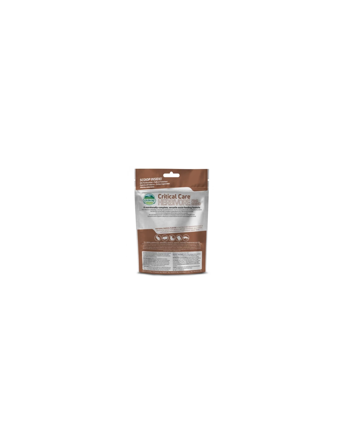 Mischiare 1 parte di Critical Care FINE GRIND con 3 parti di acqua calda. Il volume dell’acqua può essere aggiustato in modo da ottenere la consistenza ottimale. Dividere quotidianamente la miscela ottenuta in 4-6 pasti, o seguire le istruzioni del vostro veterinario di fiducia. Somministrare la miscela ottenuta tramite siringhe(SENZA AGO) o sonde per l’alimentazione. Lavare con acqua calda i residui rimasti nella siringa dopo ogni utilizzo, per evitare che il prodotto si indurisca all’interno e ostruisca il tubo. Lasciare sempre a disposizione del vostro animale dell’acqua fresca.