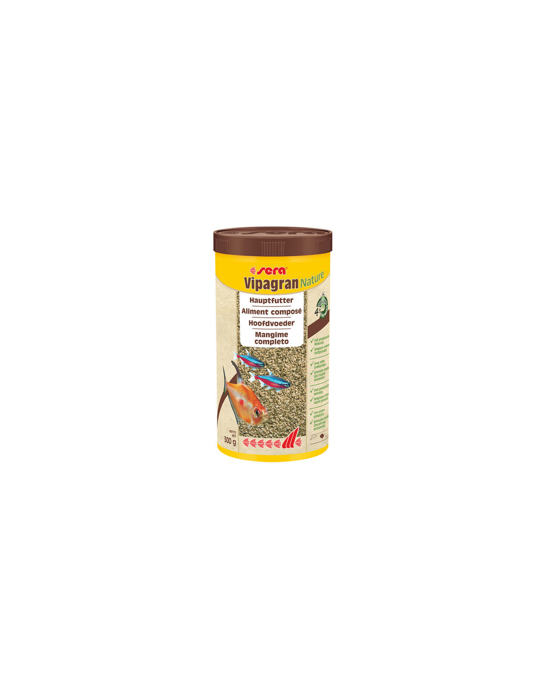 sera Vipagran Nature è il mangime completo composto da granuli morbidi prodotti in modo delicato, senza coloranti e conservanti, per tutti i pesci che mangiano a mezz’acqua.