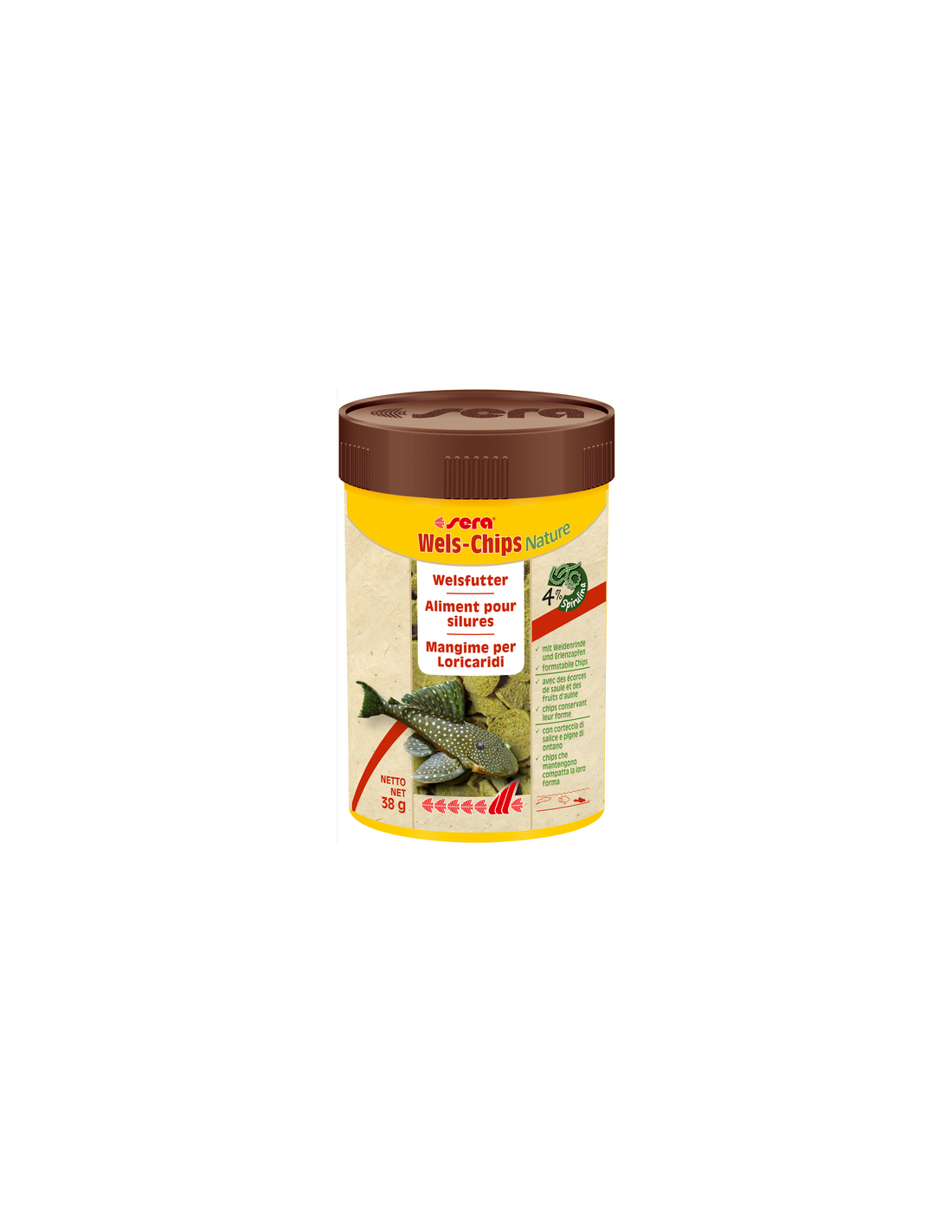 sera Wels-Chips Nature è il mangime completo senza coloranti e conservanti per i pesci da fondo che raschiano e succhiano il cibo, come Ancistrus e Loricaridi.