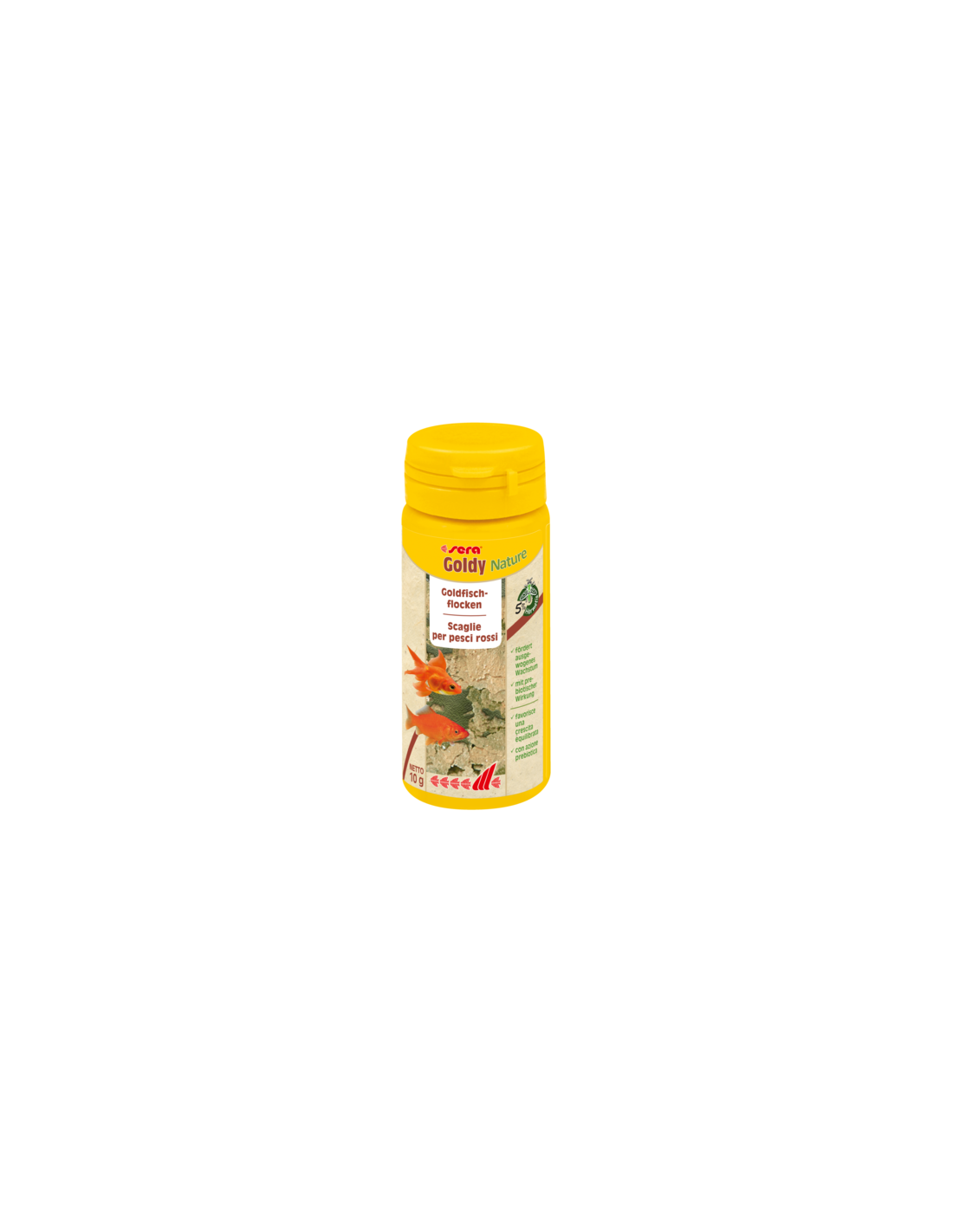 sera Goldy Nature è il mangime completo adatto ai pesci rossi piccoli e alle varianti come shubunkin, pinna a velo o sarasa, come anche ad altri pesci di acqua fredda, senza coloranti e conservanti.