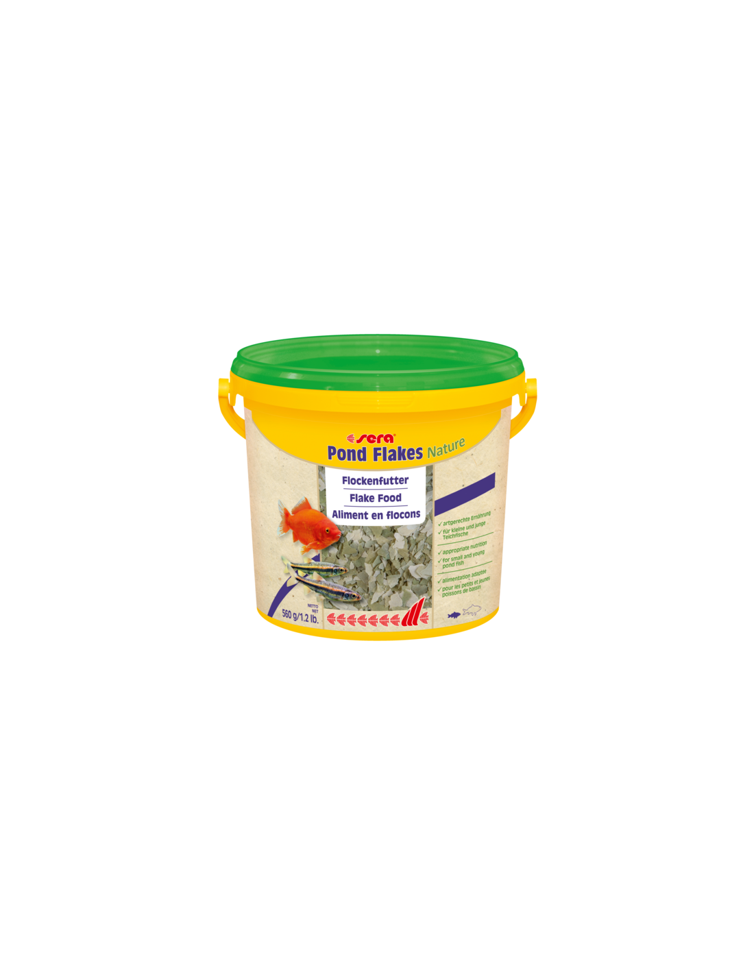 sera Pond Flakes Nature è il mangime completo composto da scaglie prodotte in modo delicato, senza coloranti e conservanti, per tutti i piccoli pesci da laghetto come pesci rossi, Rhodeus amarus e per i pesci giovani.