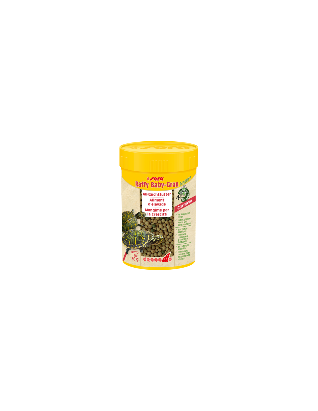 sera Raffy Baby-Gran Nature è il mangime per la crescita senza coloranti e conservanti, composto da granuli prodotti in modo delicato per giovani rettili carnivori come le piccole tartarughe acquatiche.
