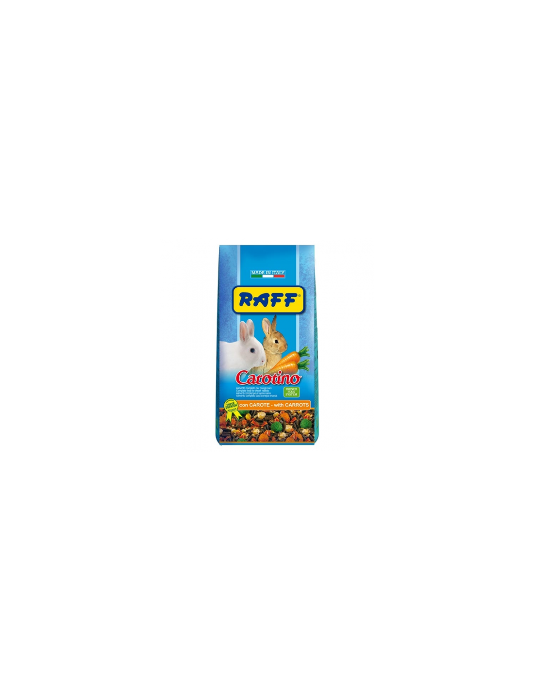 Raff Carotino rappresenta l’alimento premium quotidiano di base per tutti i conigli nani. Con la parola “premium” si indica una categoria di alimenti fabbricati con materie prime di altissima qualità e con una appetibilità superiore alla media. In più Raff Carotino risponde pienamente agli innovativi concetti dietetici che caratterizzano la produzione Raff ( vedasi scheda “Gli alimenti emozionali”). In virtù delle sue eccezionali caratteristiche Raff Carotino è senza dubbio il miglior alimento per i Vostri coniglietti nani. Il confezionamento in atmosfera modificata (Frescoplus System) garantisce a lungo la freschezza e la conservazione del prodotto senza ricorrere all’impiego di conservanti chimici.