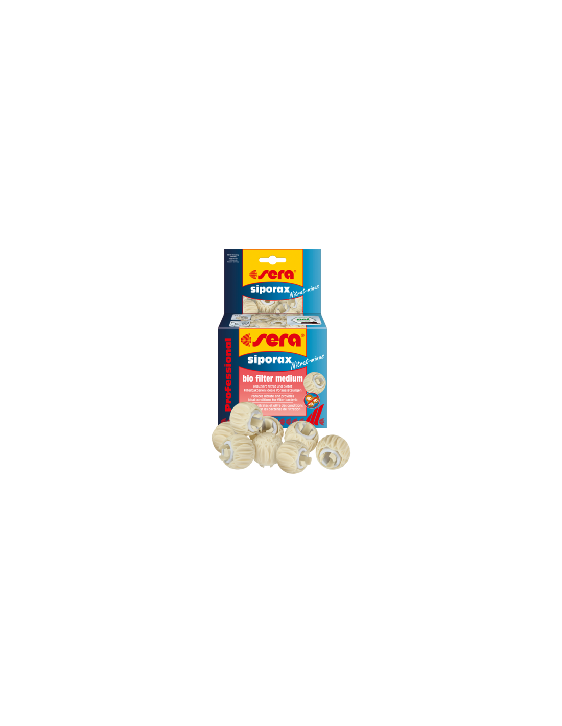 Il sera siporax Nitrat-minus Professional è un materiale filtrante ad alte prestazioni per l'abbattimento biologico dei nitrati con il parallelo abbattimento di nitriti e ammonio. Grazie alla sfera in biopolimero, abbinata all'anello interno di siporax, la denitrificazione è aumentata e massimizzata in modo ottimale. Il biopolimero degradabile serve come fonte di carbonio per i batteri che riducono i nitrati.