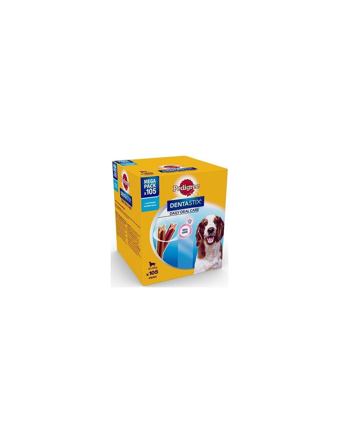 Quattro cani su cinque, oltre i 3 anni, hanno problematiche alle gengive a causa della formazione di placca e tartaro. Pedigree DentaStix Daily Oral Care è scientificamente provato, contribuisce a ridurre la formazione del tartaro fino all'80%, pulisce i denti più difficili da raggiungere e contribuisce a mantenere gengive sane.
