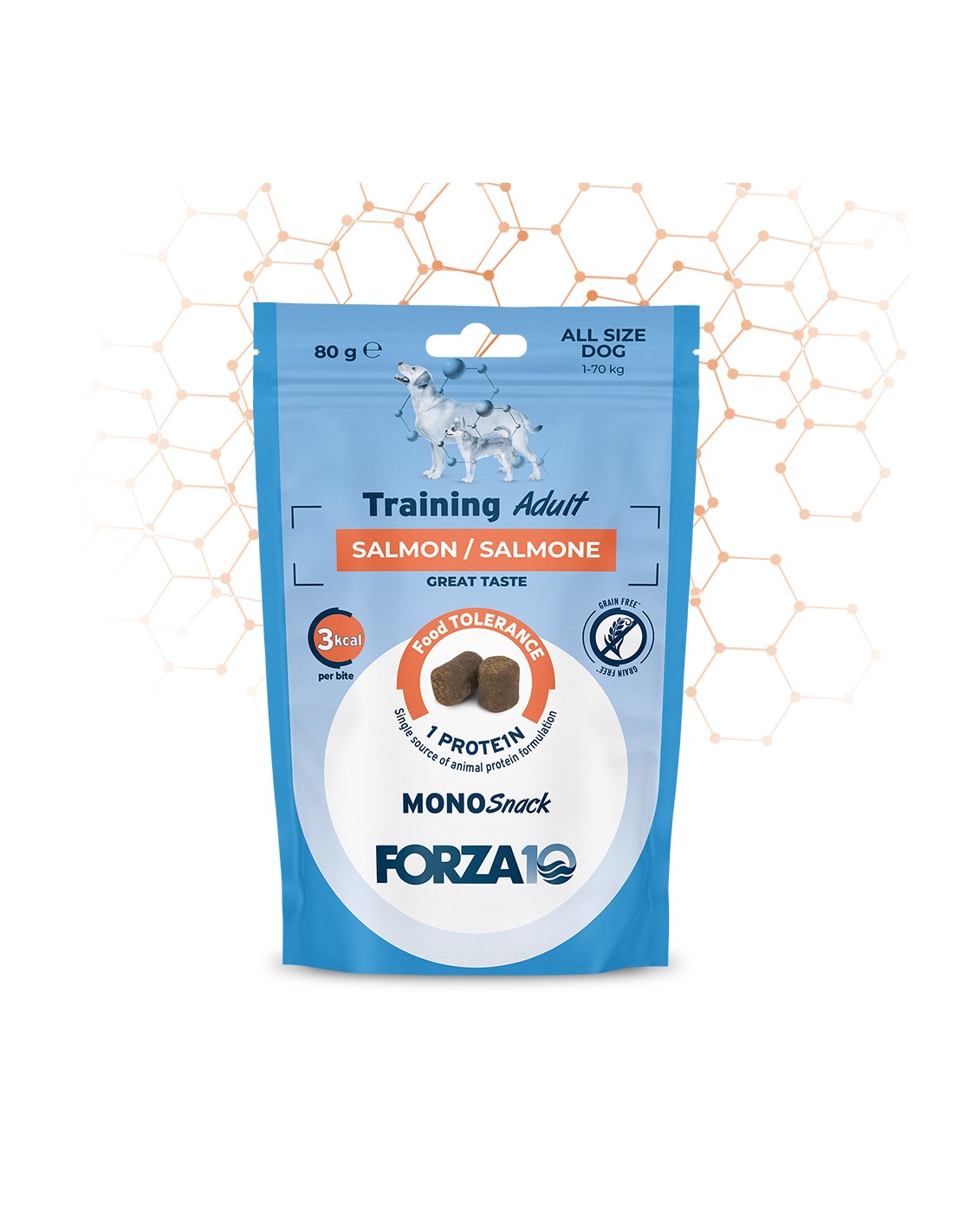 Composizione: salmone idrolizzato 26%, patata dolce, fibre di patata, baccelli di lupino, fiocchi di piselli, amido di tapioca, glicerina vegetale, lievito di birra, alghe, olio di girasole.