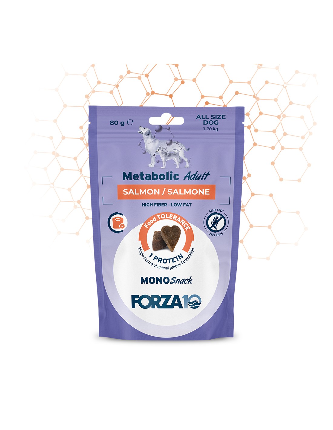 Composizione: salmone disidratato 27%, bacelli di lupino, patata dolce, glicerina vegetale, fibra di patata, fiocchi di patata, pomodoro in polvere, alghe, olio di girasole.