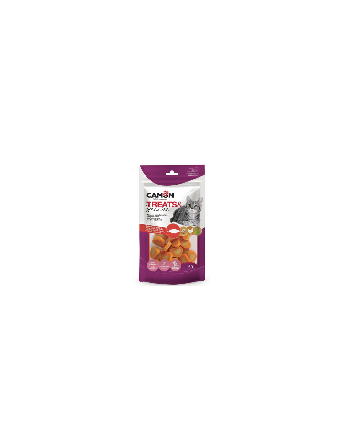 Deliziosi e morbidi snack a forma di cuoricini per gatti, con salmone, pollo, lievito di birra e al gusto di thè verde.