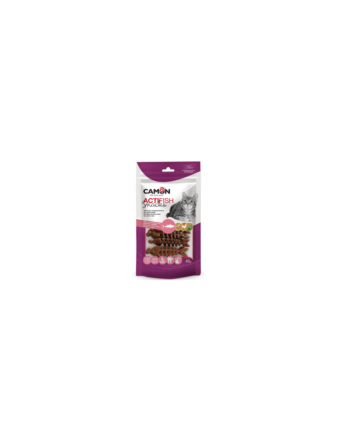 ACTIFISH è lo lo snack che, grazie alla papaina, i polifosfati di sodio e la sua particolare struttura, contribuisce a ridurre la formazione della placca dentale e, se assemblato con gli snack ACTIBONES, diventa uno sfizioso compagno di divertimento per il tuo gatto!