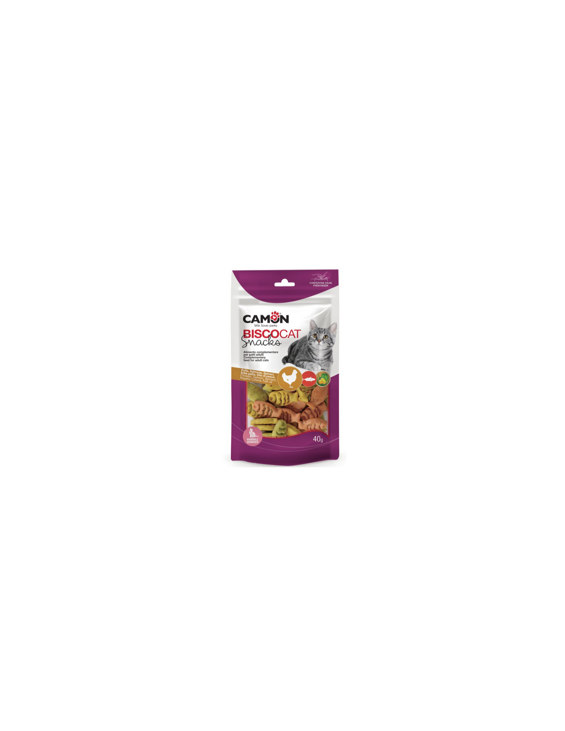 Deliziosi snack a forma di pesciolini per gatti, con salmone, pollo, ed ai gusti di erba gatta e spinaci.