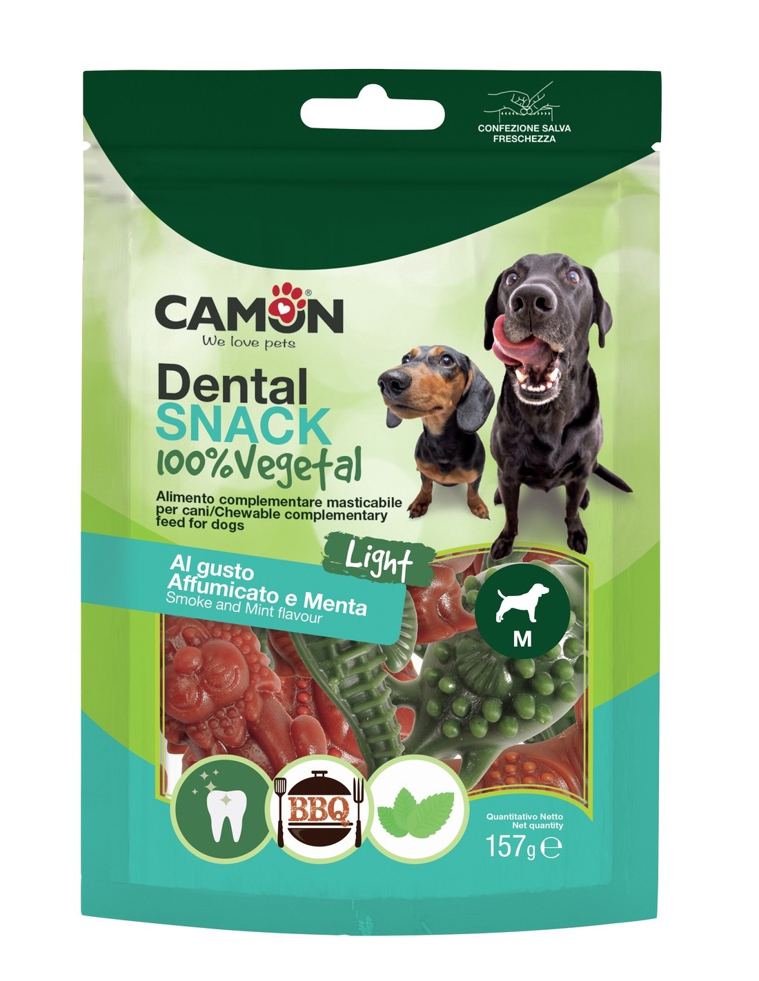 Sfiziosi snack 100% vegetali, un alimento complementare masticabile per cani, molto utili anche per la pulizia dentale.Composizione a base di farine di patata dolce, piselli e avena.Al gusto affumicato e menta.Quantità: 157 gDimensione: 6,5 ÷ 10 cm