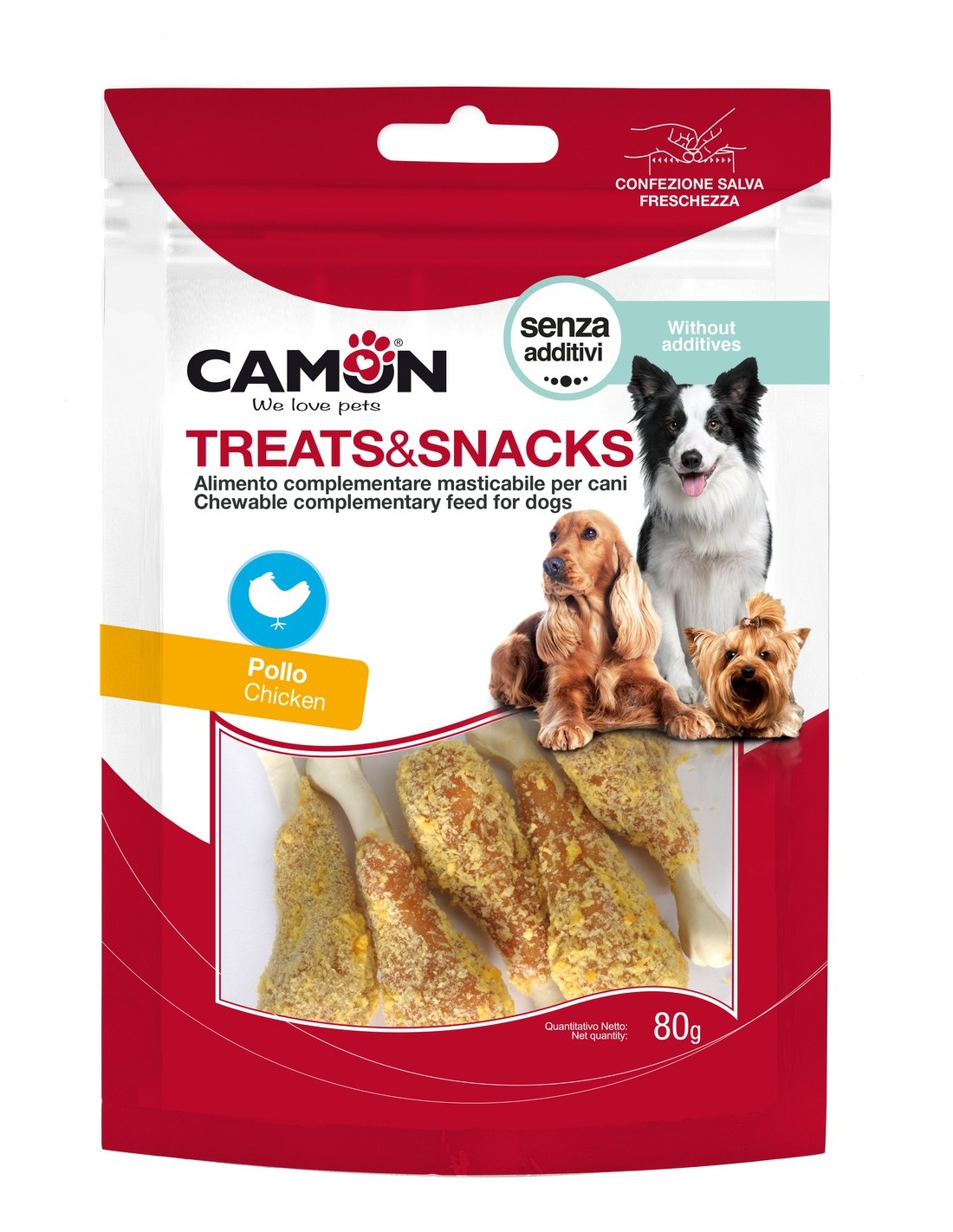 Deliziose coscette impanate di pollo, uno sfizioso spuntino ricompensa per cani.Senza additivi.Quantità: 80 gDimensioni: 8,5 cm