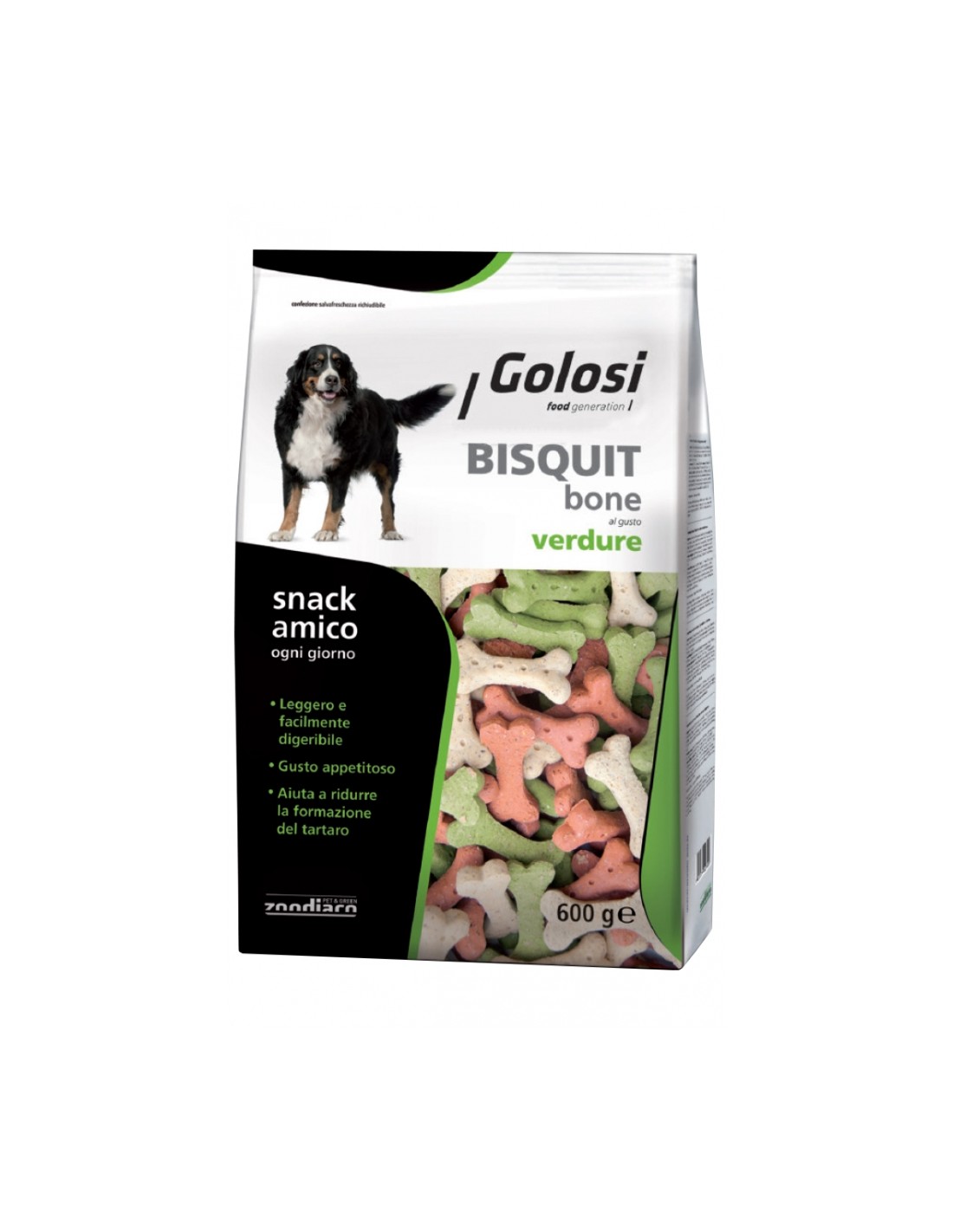 Bisquit BONE al gusto Verdure è un biscotto leggero e appetitoso, ideale come snack o premio per il tuo amico a quattro zampe. La particolare forma ad osso aiuta a ridurre la formazione del tartaro grazie all'azione meccanica della masticazione. Le materie prime di qualità lo rendono inoltre leggero e facilmente digeribile.