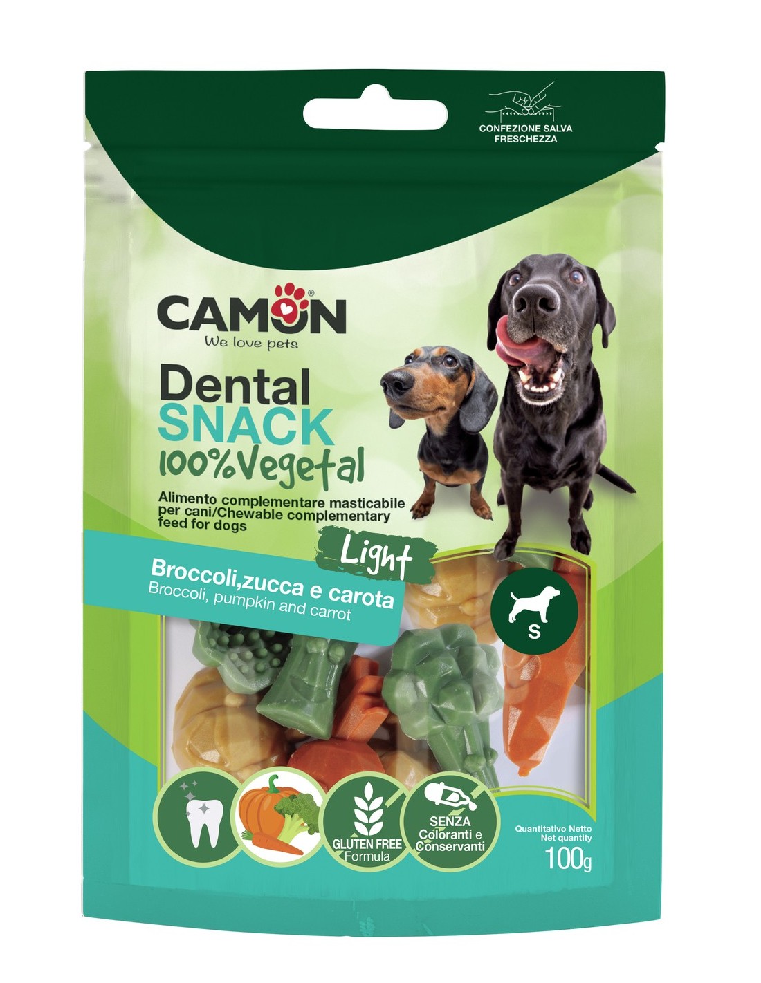 Sfiziosi snack 100% vegetali nelle forme di alcuni ortaggi, un utile alimento per stimolare la masticazione del cane.- formula gluten free- senza coloranti né conservanti- ai gusti di broccolo, zucca e carota