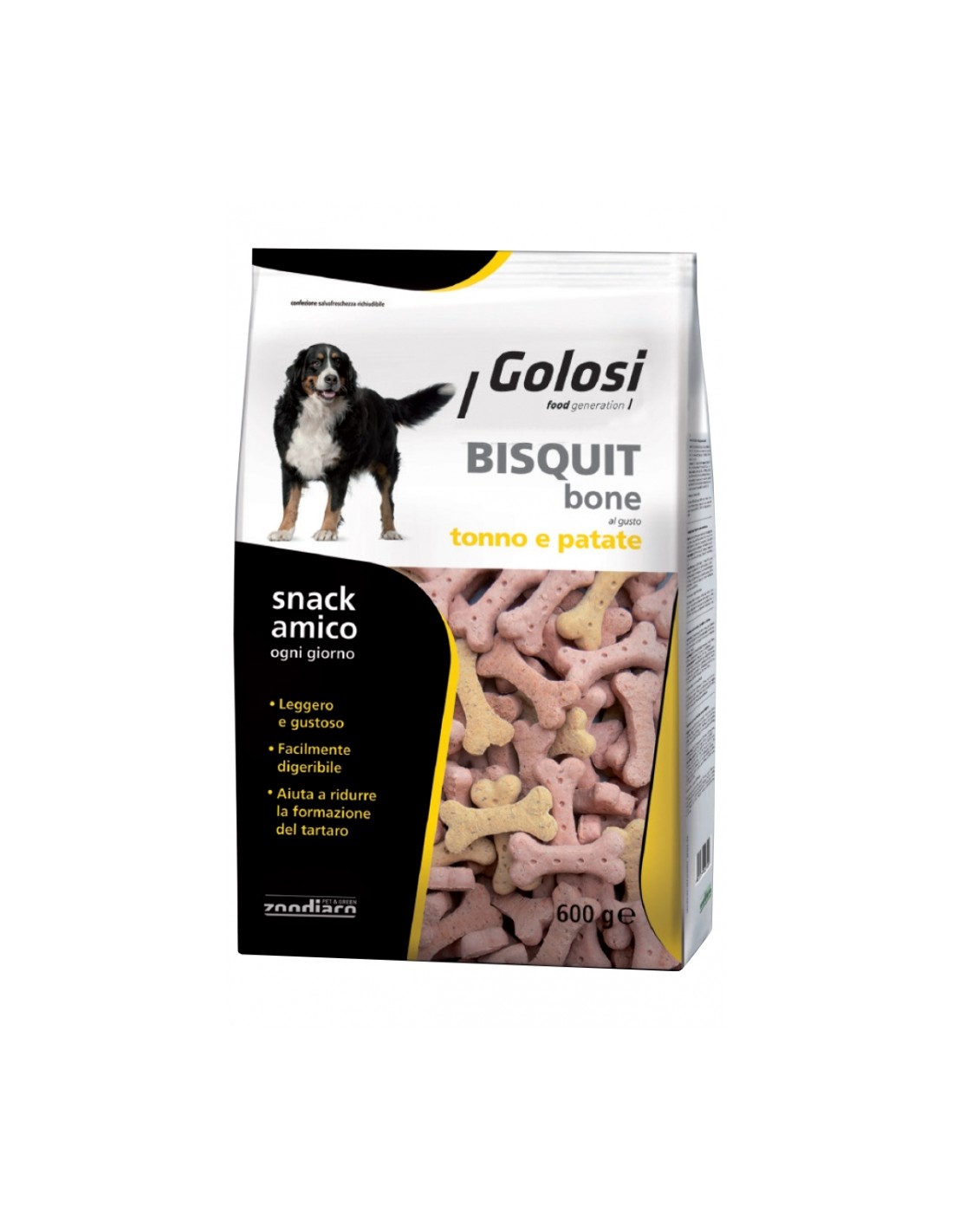 Bisquit BONE al gusto Tonno e Patate è un biscotto leggero e appetitoso, ideale come snack o premio per il tuo amico a quattro zampe. La particolare forma ad osso aiuta a ridurre la formazione del tartaro grazie all'azione meccanica della masticazione mantendedo così la salute di denti e gengive. Le materie prime di qualità lo rendono inoltre leggero e facilmente digeribile.